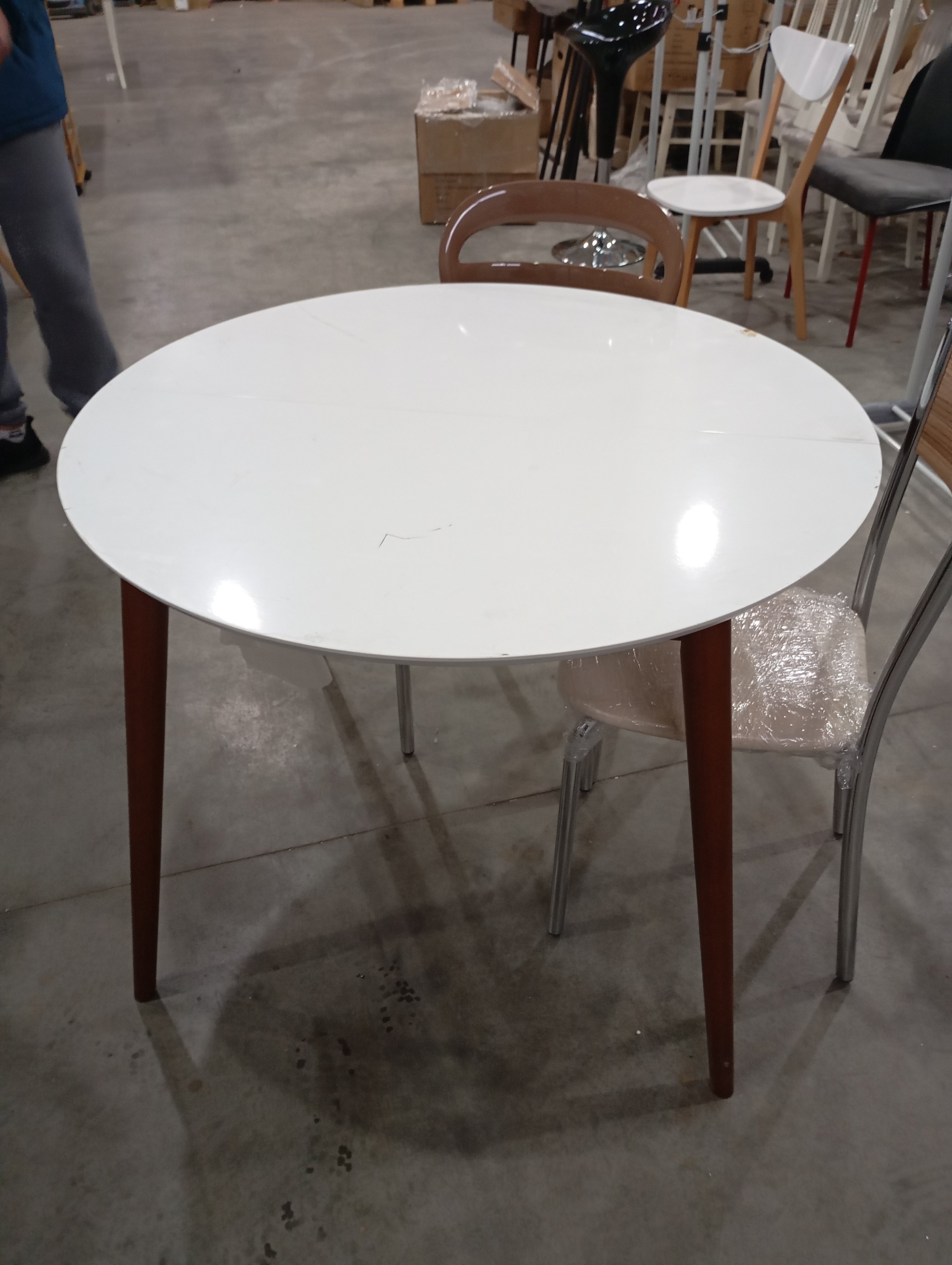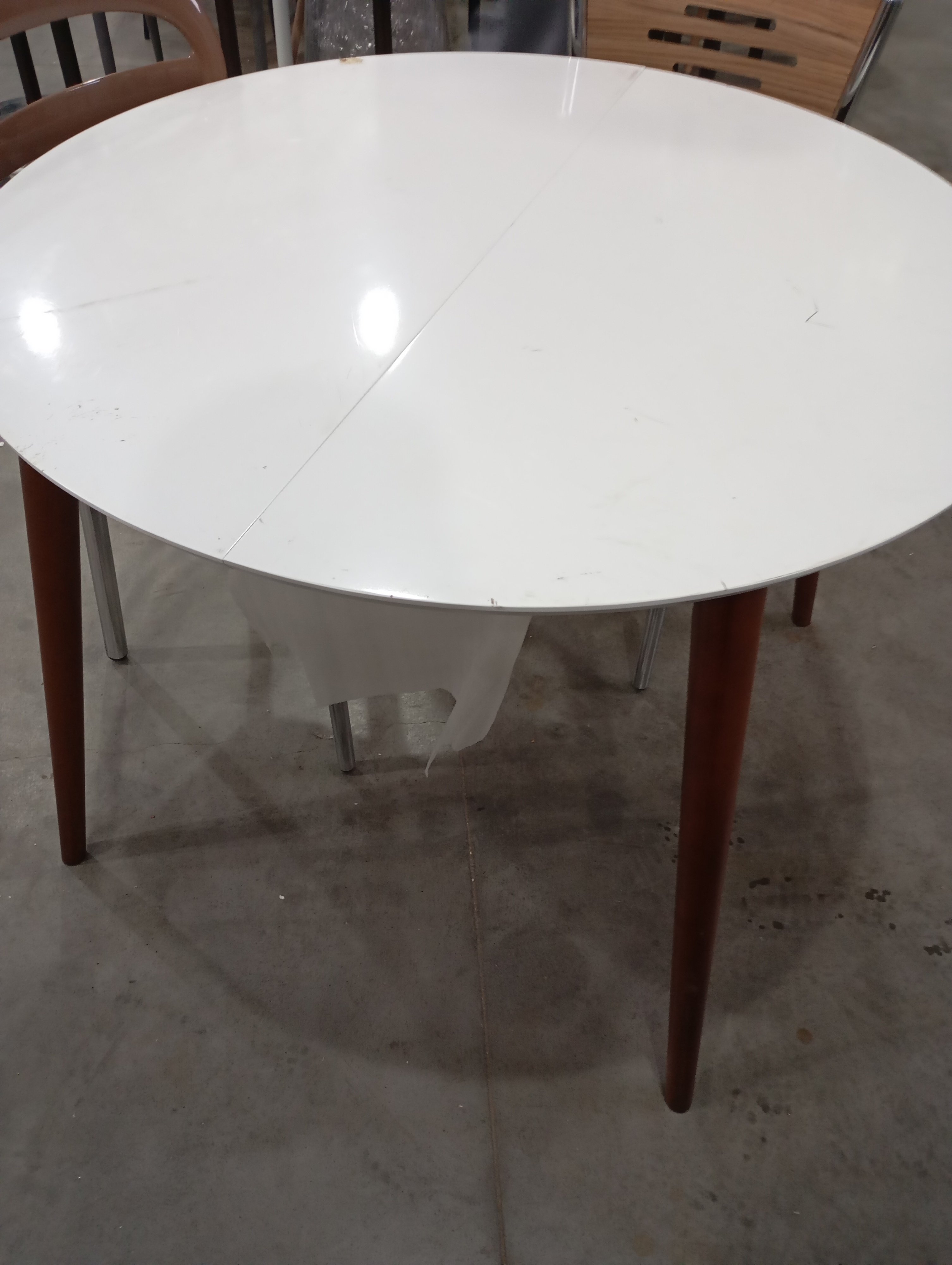 Описание товара без дефектов: Стильный обеденный стол BOSCO из Датской коллекции отлично дополнит интерьер загородного дома, городской квартиры, кухни, гостиной, кафе или ресторана. Контрастное сочетание столешницы, покрашенной в белый цвет, и визуально легких коричневых ножек выглядит стильно и привлекательно. Обеденный стол BOSCO хорошо впишется в любой современный интерьер. Модель имеет основательный раздвижной механизм, который позволит разместить с комфортом всю вашу семью. Круглая форма столешницы помогает создать свободную и легкую атмосферу в комнате, способствует спокойному и приятному общению. Изящные тонкие ножки изготовлены из натуральной экологически чистой древесины ─ массива бука. Столешница из МДФ со шпоном бука и глянцевым напылением не требует специального ухода, выдерживает воздействие жидкости и тепла. Стол поставляется в разобранном виде, необходима несложная сборка по инструкции.