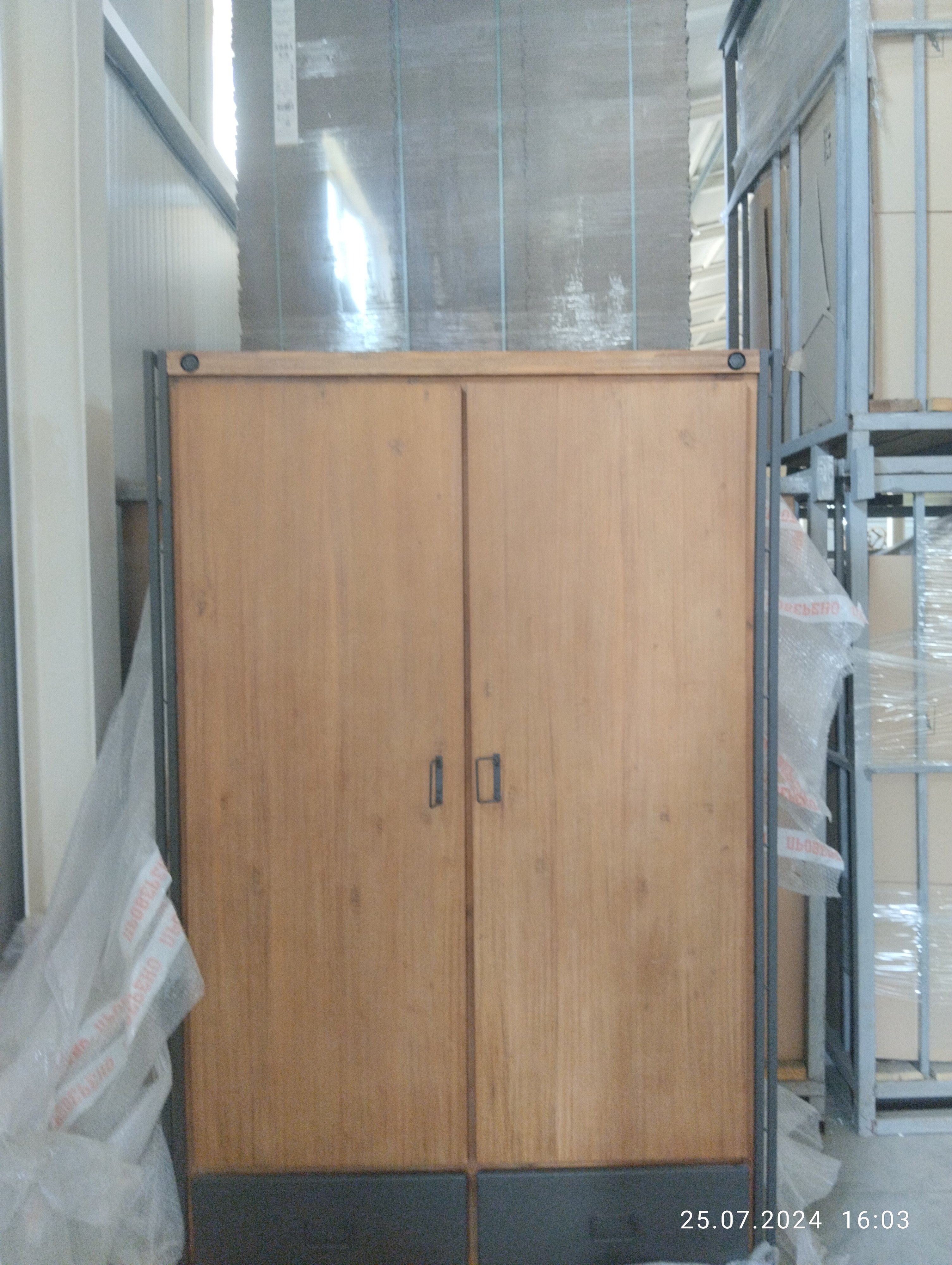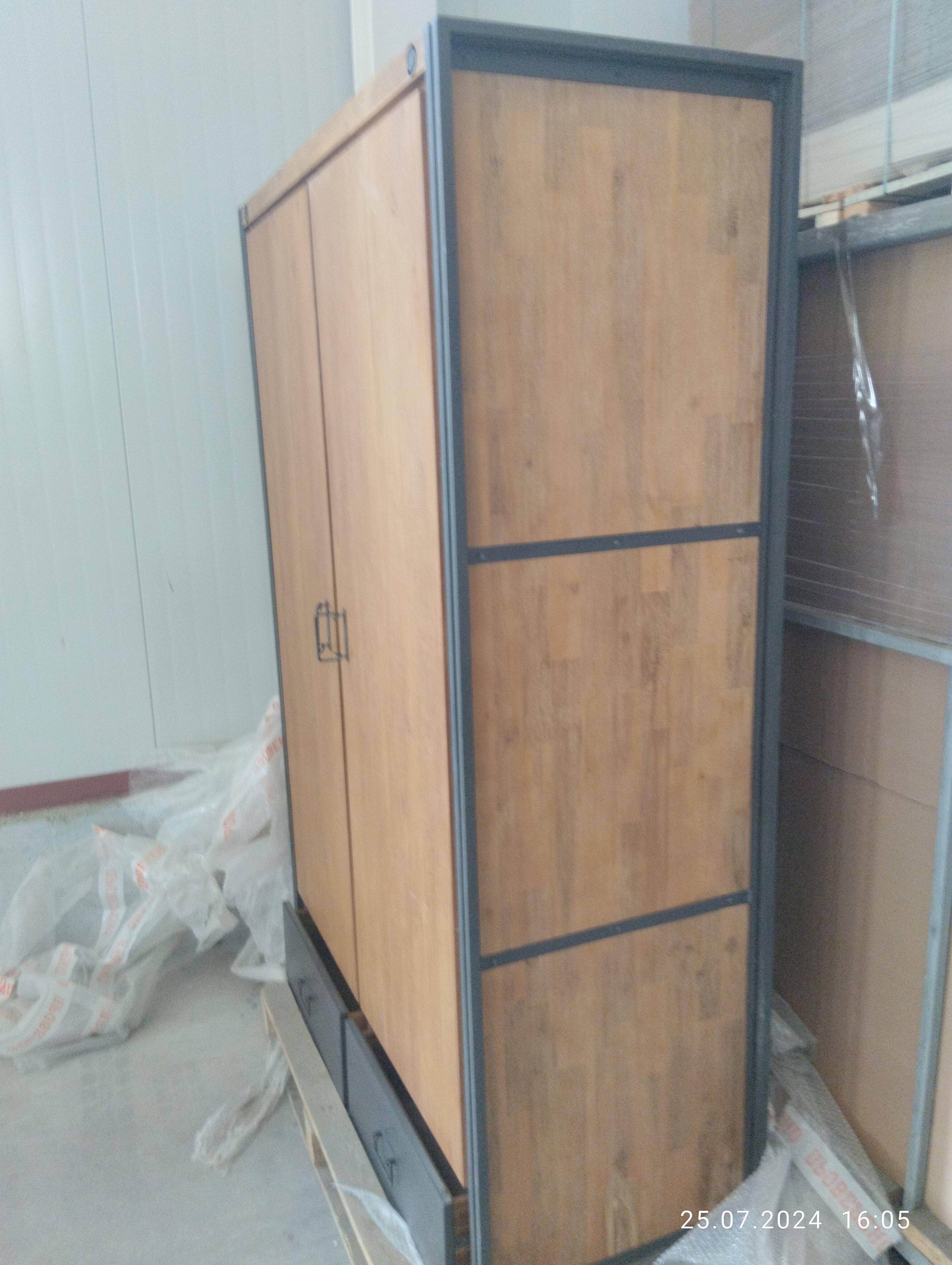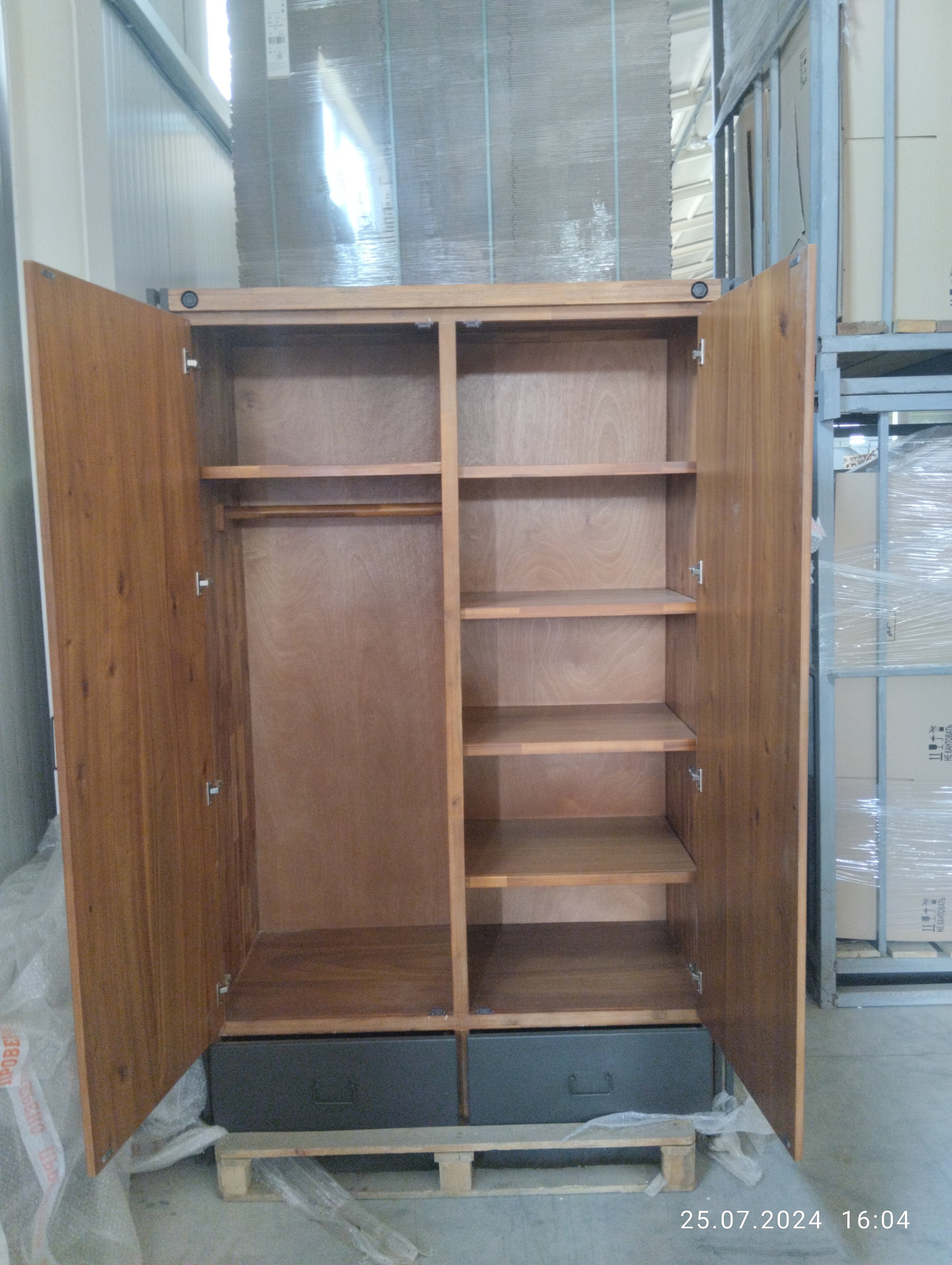 Описание товара без дефектов: 1 полка и кронштейн в левой части, 4 полки в правой, 2 выдвижных ящика внизу. Материал: каркас, выдвижные ящики - металл, корпус - акация. Цвет: коричневый дым (smoke brown B034). Размеры: 140х60х220 см
