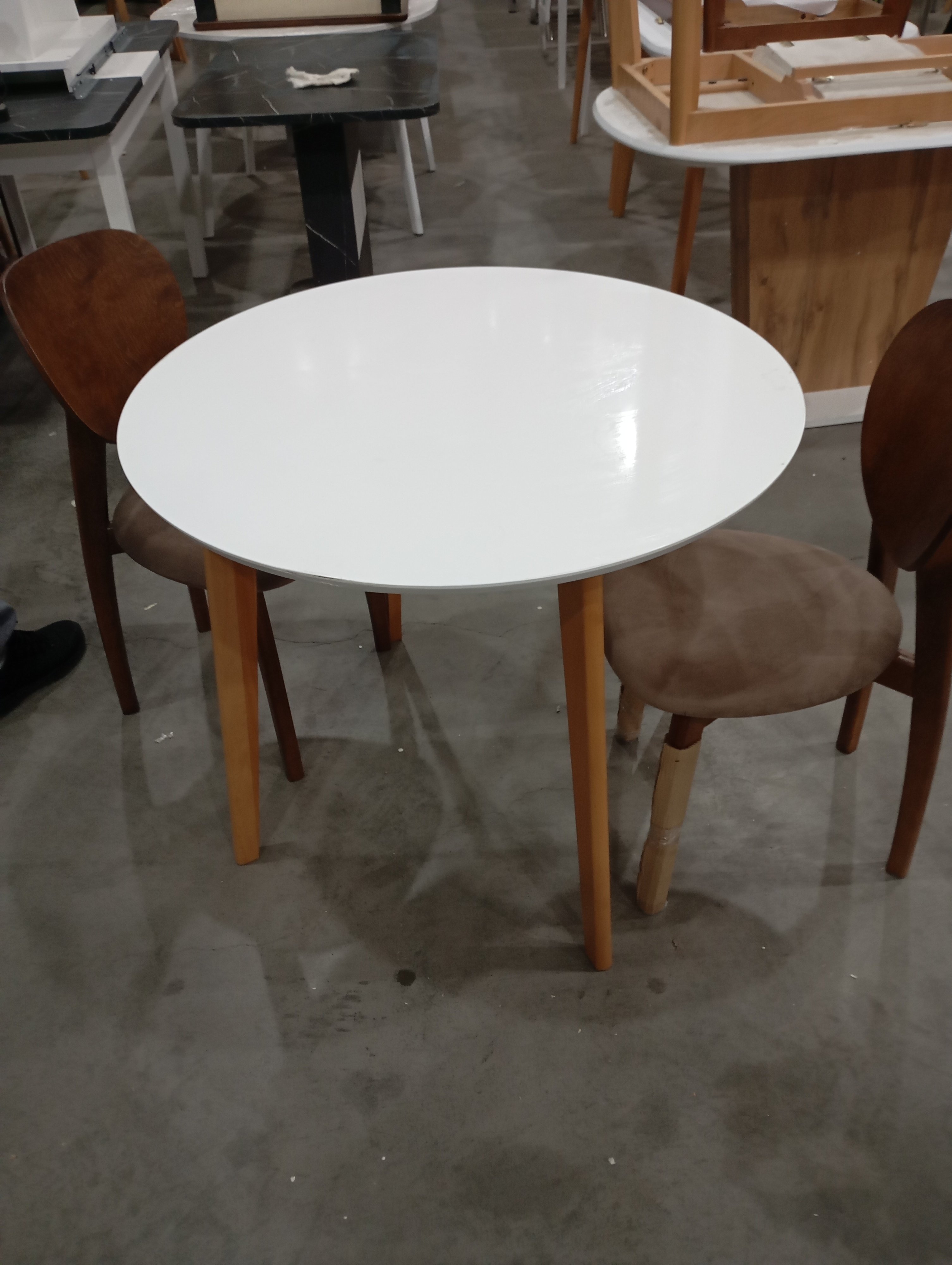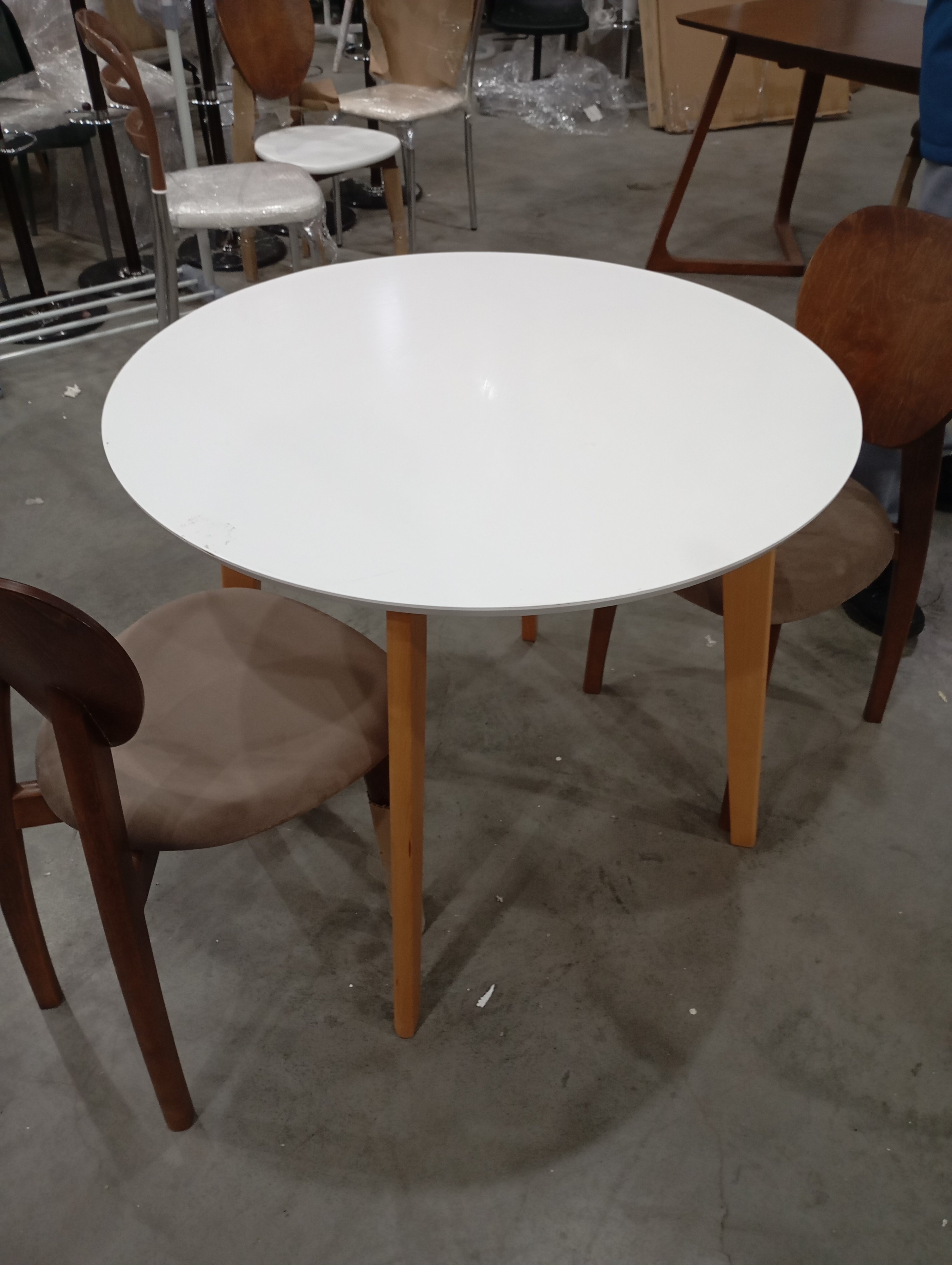 Описание товара без дефектов: Стильный обеденный стол BOSCO из Датской коллекции отлично дополнит интерьер загородного дома, городской квартиры, кухни, гостиной, кафе или ресторана. Компактный и аккуратный стол отлично подойдет даже для небольших помещений. Удачное сочетание столешницы, покрашенной в белый цвет, и визуально легких ножек цвета натурального дерева выглядит стильно, легко и привлекательно. Обеденный стол BOSCO хорошо впишется в любой современный интерьер. Круглая форма столешницы помогает создать свободную и легкую атмосферу в комнате, способствует спокойному и приятному общению. Изящные тонкие ножки изготовлены из натуральной экологически чистой древесины ─ массива бука. Столешница из МДФ со шпоном бука и глянцевым напылением не требует специального ухода, выдерживает воздействие жидкости и тепла. Модель поставляется в разобранном виде, необходима несложная сборка по инструкции.