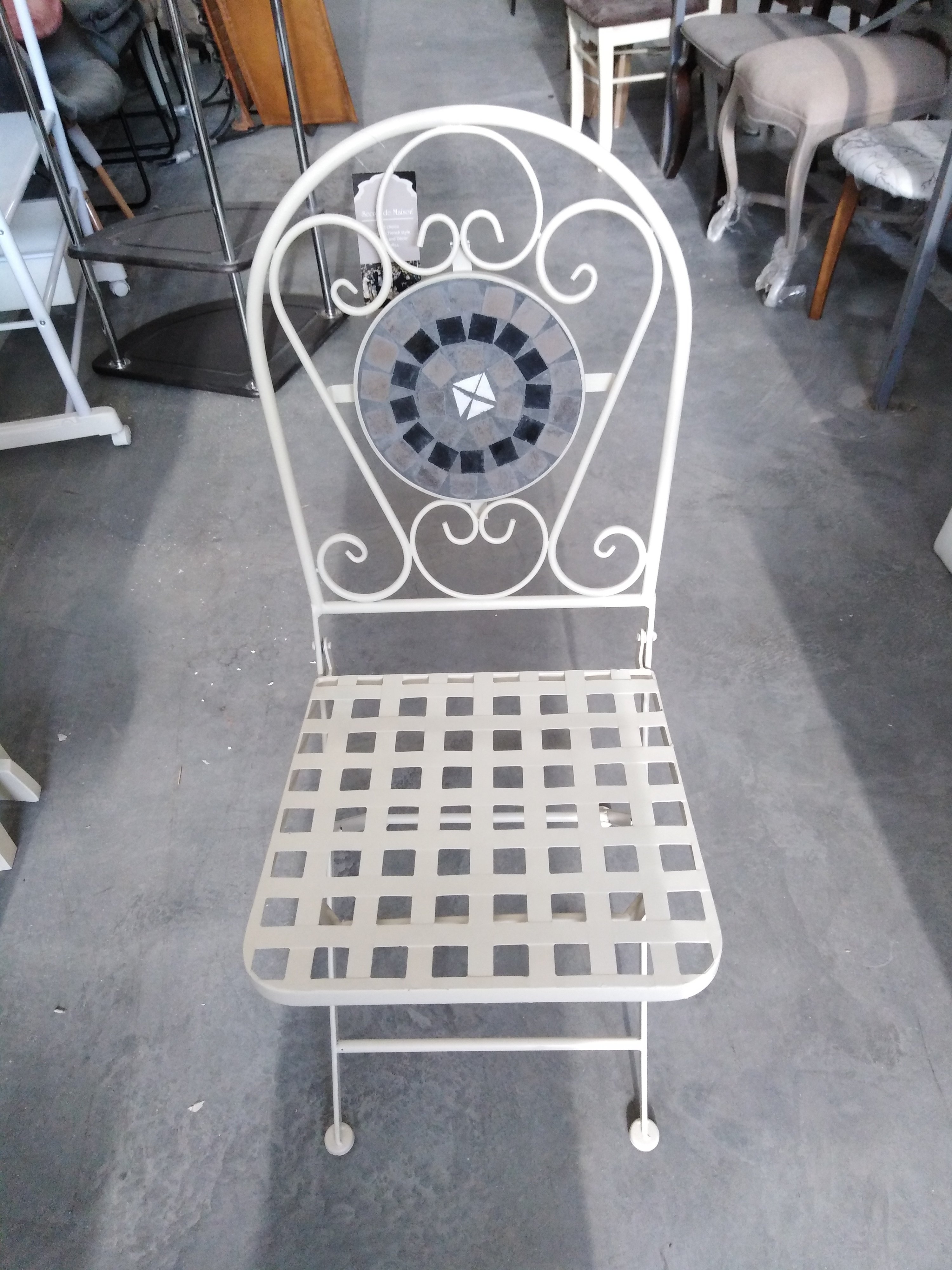 Описание товара без дефектов: Изящная форма и изысканный дизайн компактного складного стула Secret De Maison Vicenza/Виченза из французской коллекции Beaujolais/Божоле не только выгодно выделяют его в интерьере, но и помогут создать гармоничное пространство на загородной веранде, городском балконе или приусадебном участке. Спинка, украшенная оригинальным винтажным орнаментом из мозаики и коваными узорами ручной работы, прочный каркас, изготовленный из стального сплава с напылением краски, выглядят дорого, элегантно, добавят ноты изысканности и индивидуальности в ваш интерьер. Стул легко складывается и раскладывается, не занимает много места при хранении. Модель практична, надежна, способна выдерживать большие нагрузки, устойчива к воздействию влаги, температурным перепадам и проста в уходе. Стул Vicenza/Виченза прекрасно сочетается со столом Secret de Maison Romeo/Ромео и с мебелью из коллекции Beaujolais/Божоле, поставляется в собранном виде. Для вашего удобства на сиденье можно дополнительно приобрести декоративную подушку из нашей коллекции текстиля.