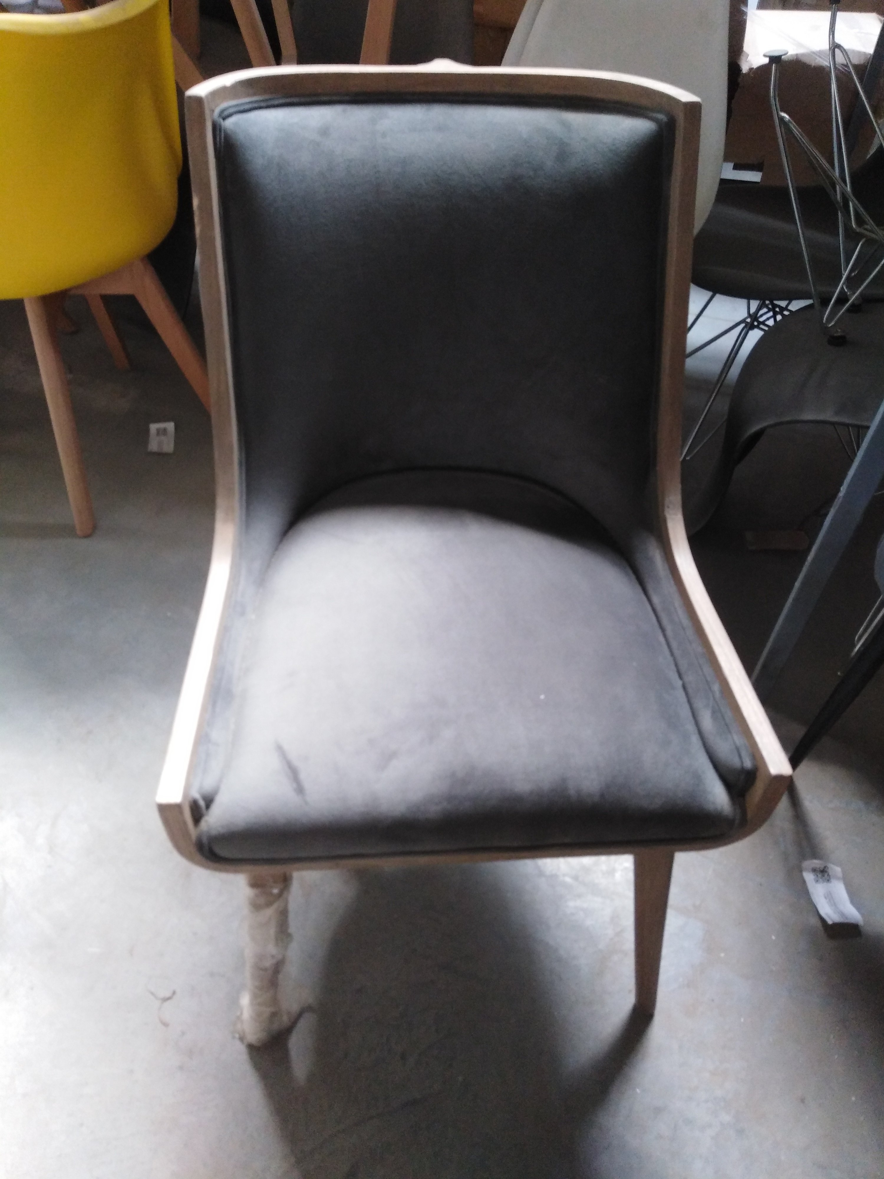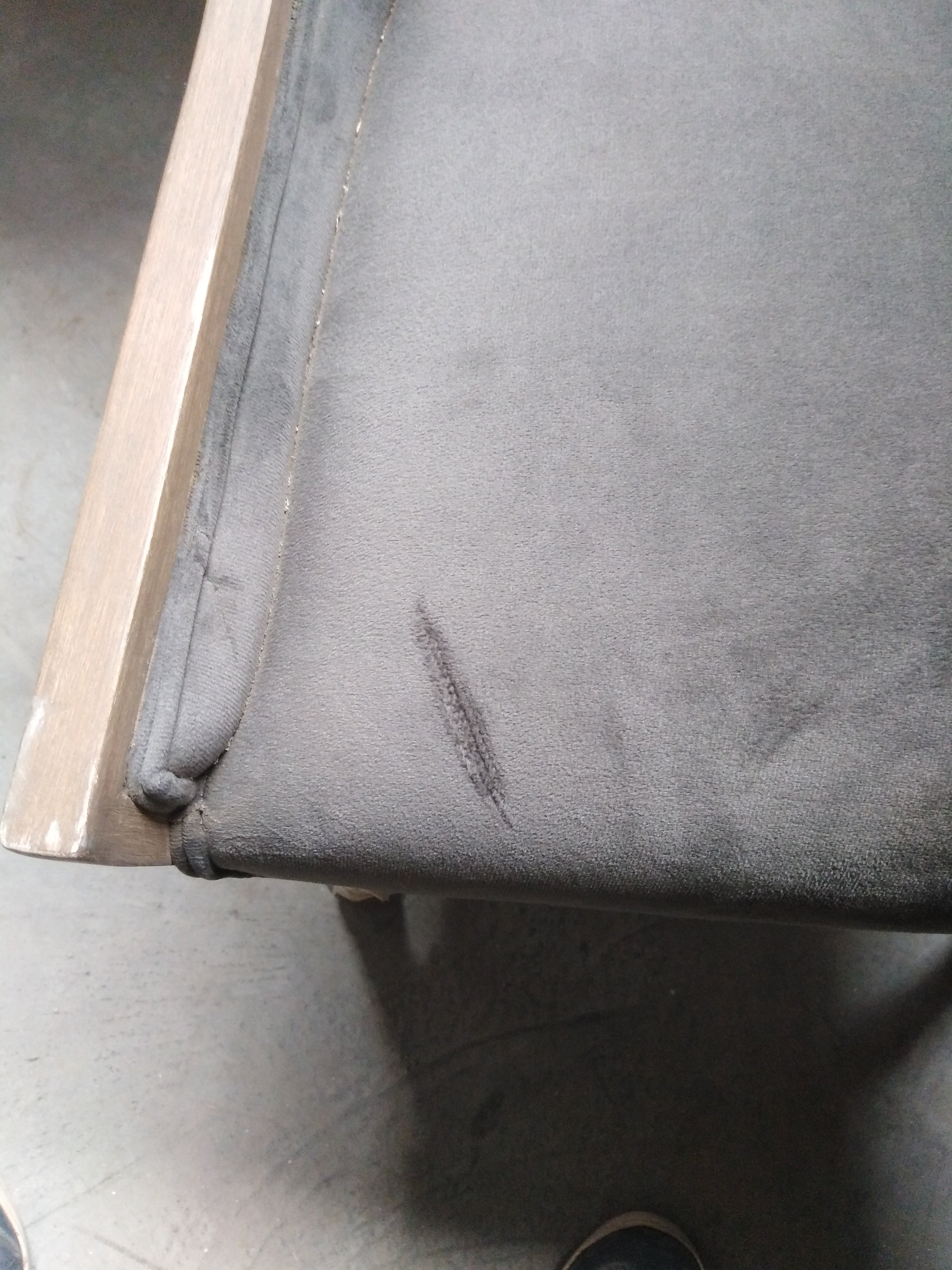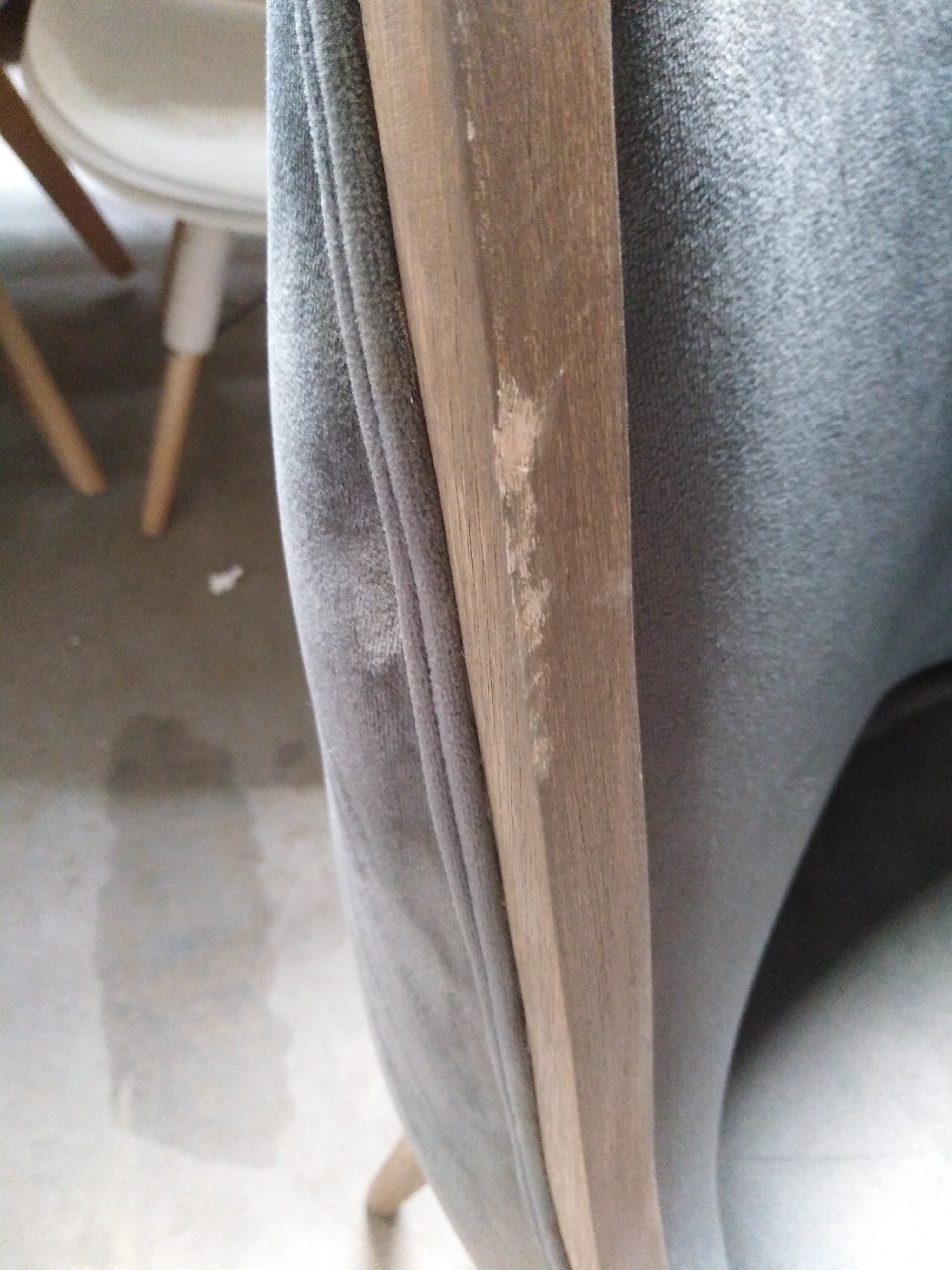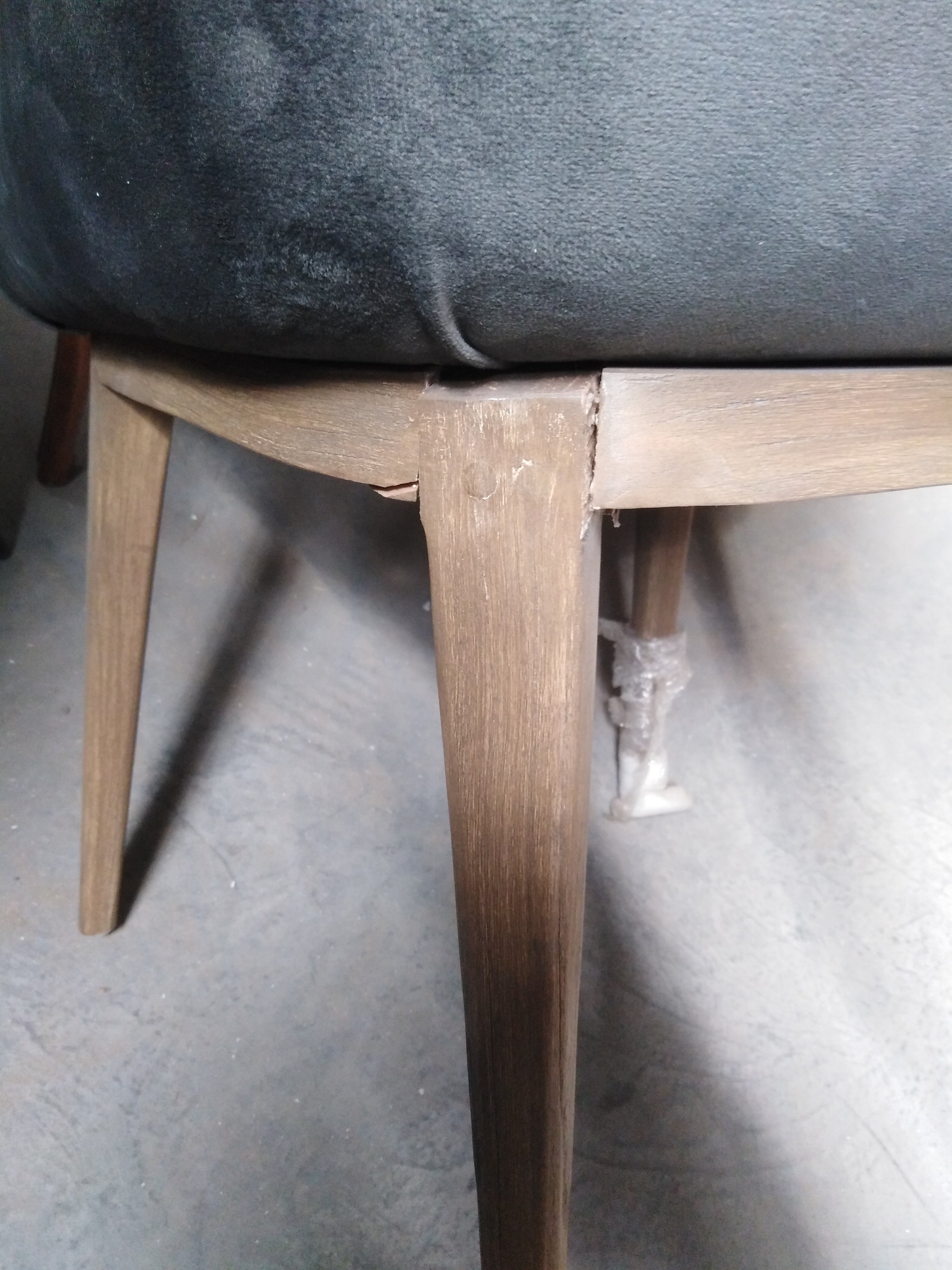 Описание дефекта: Подломлена передняя прпвая и задняя левая ножка, Трещины и сколы по деревянным поверхностям. Загрязнённость материи на сидении