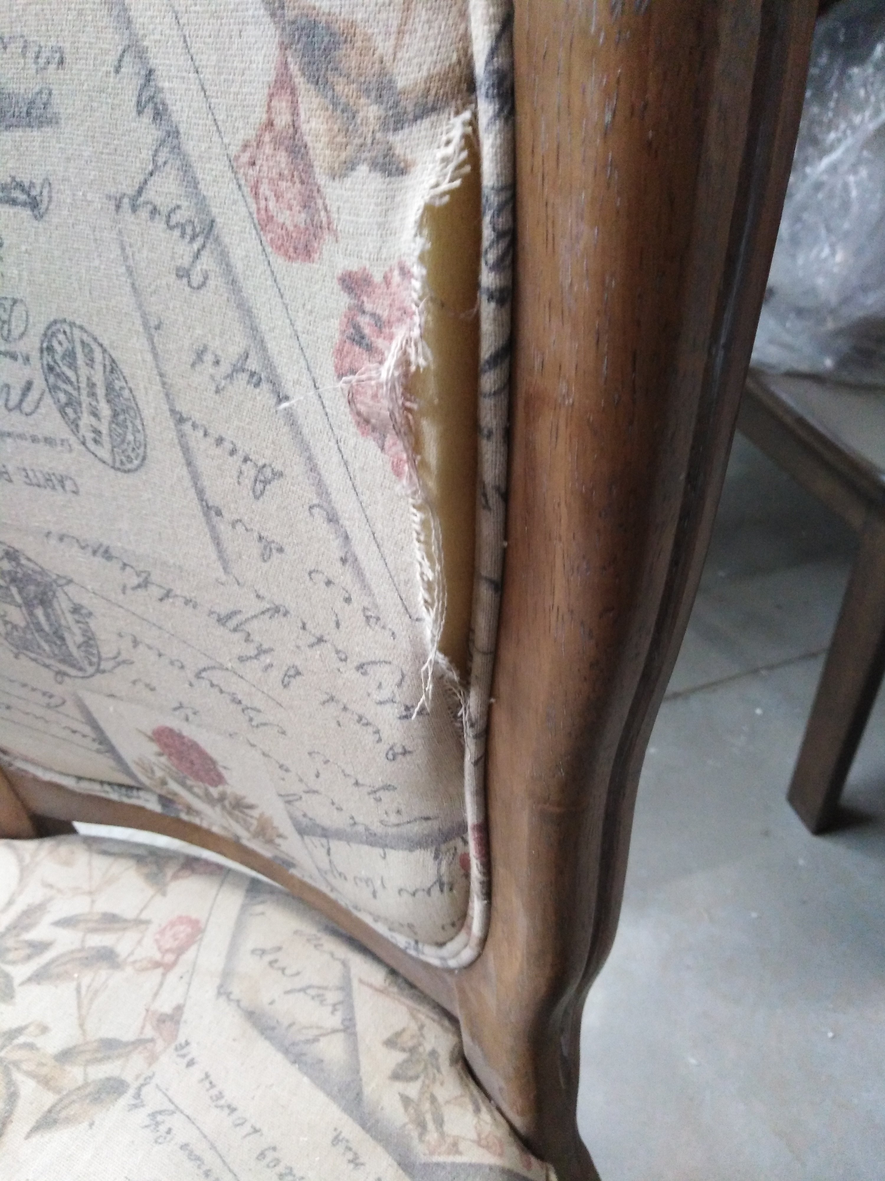 Описание дефекта: Нарушение ЛКП на деревянных деталях.Разошлась ткань на спинке