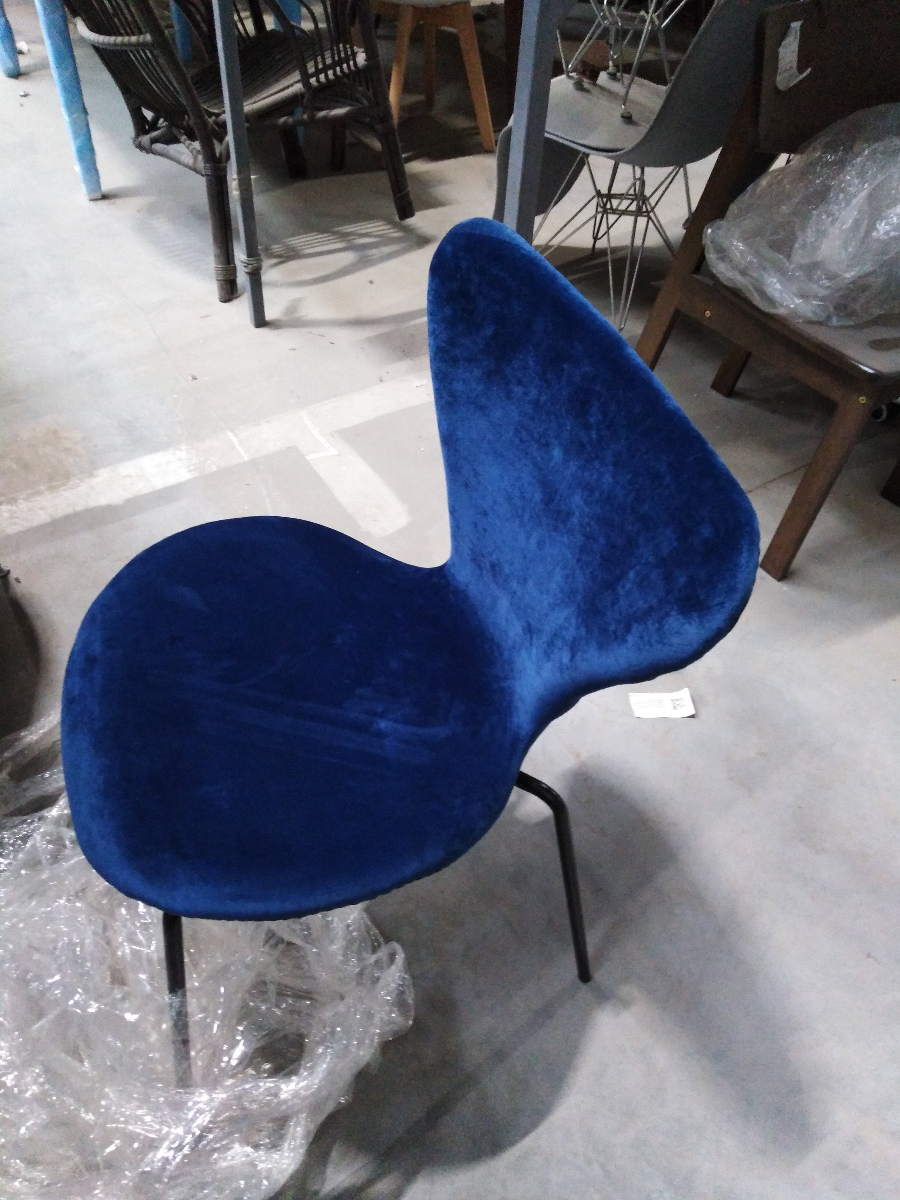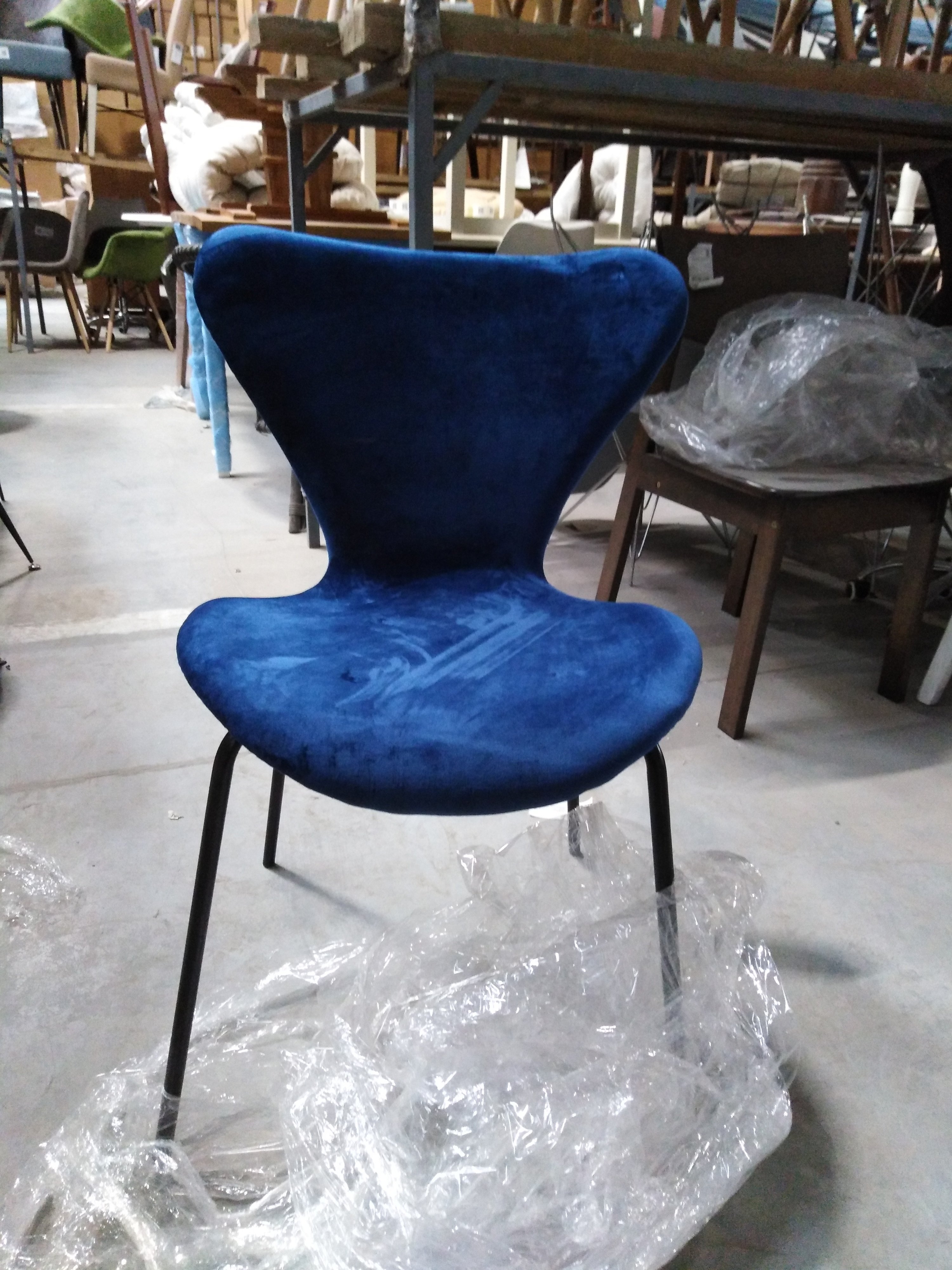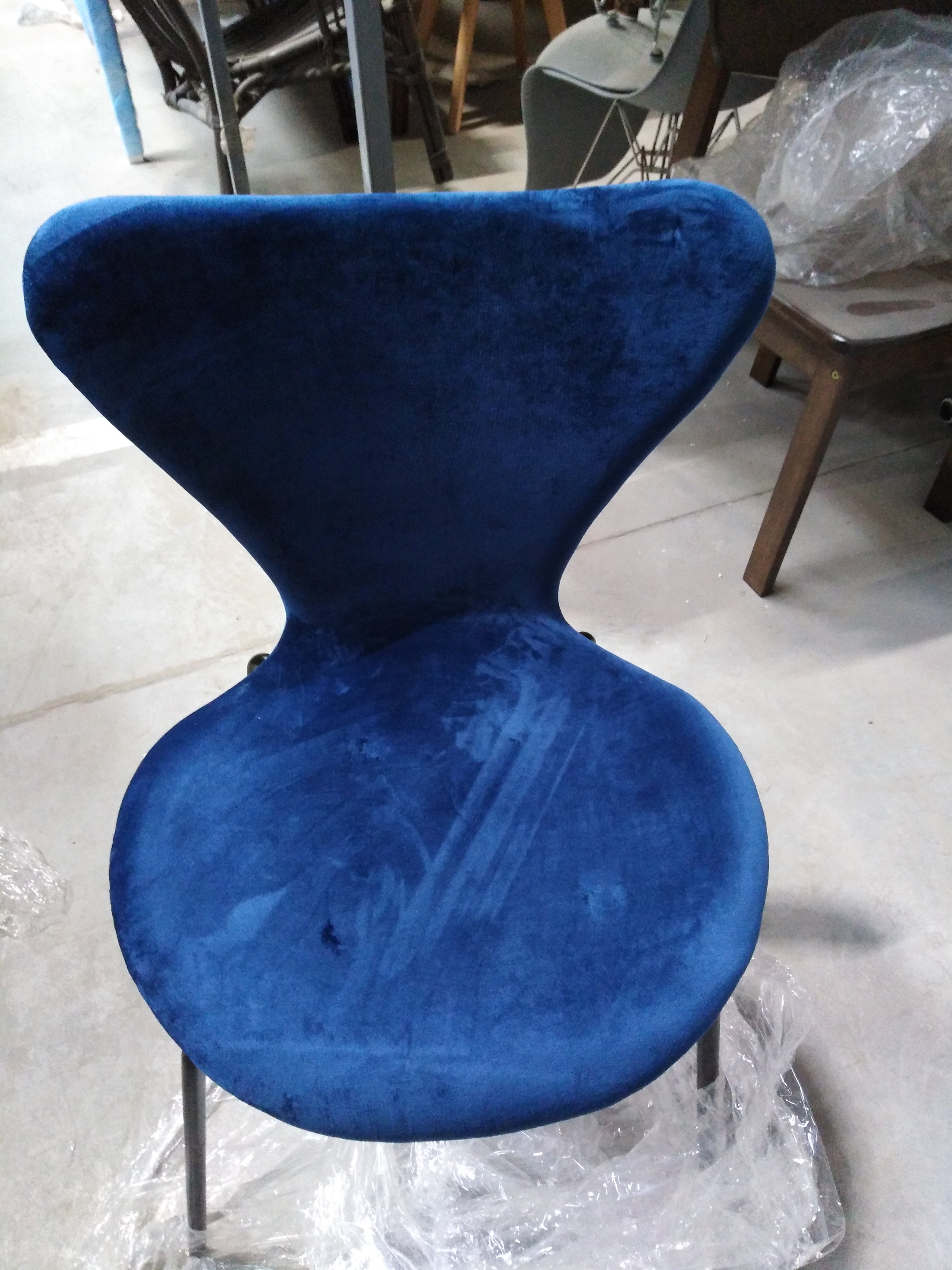 Описание товара без дефектов: Изящный силуэт стула Jacobsen SOFT, созданного в стиле знаменитого стула Series 7 датского дизайнера Арне Якобсена, украсит практически любой интерьер. Изогнутые формы с мягкими и утонченными линиями, напоминающие стиль модерн середины двадцатого века, не теряют своей актуальности. Принципы эргономики и лаконичности ярко прослеживаются в дизайне стула. Теплая бархатистая поверхность сиденья синего цвета и спинки обеспечит максимальный уют и комфорт. Стул отлично выглядит со всех сторон, он создаст комфортную обстановку дома, будет смотреться стильно и элегантно в кафе или ресторане. Тканевая обивка из флока обладает повышенной износостойкостью, гипоаллергенна и способна на долгие годы сохранить свой первоначальный цвет, не протираясь и не выцветая. Модель относится к коллекции Modern, поставляется в разобранном виде.