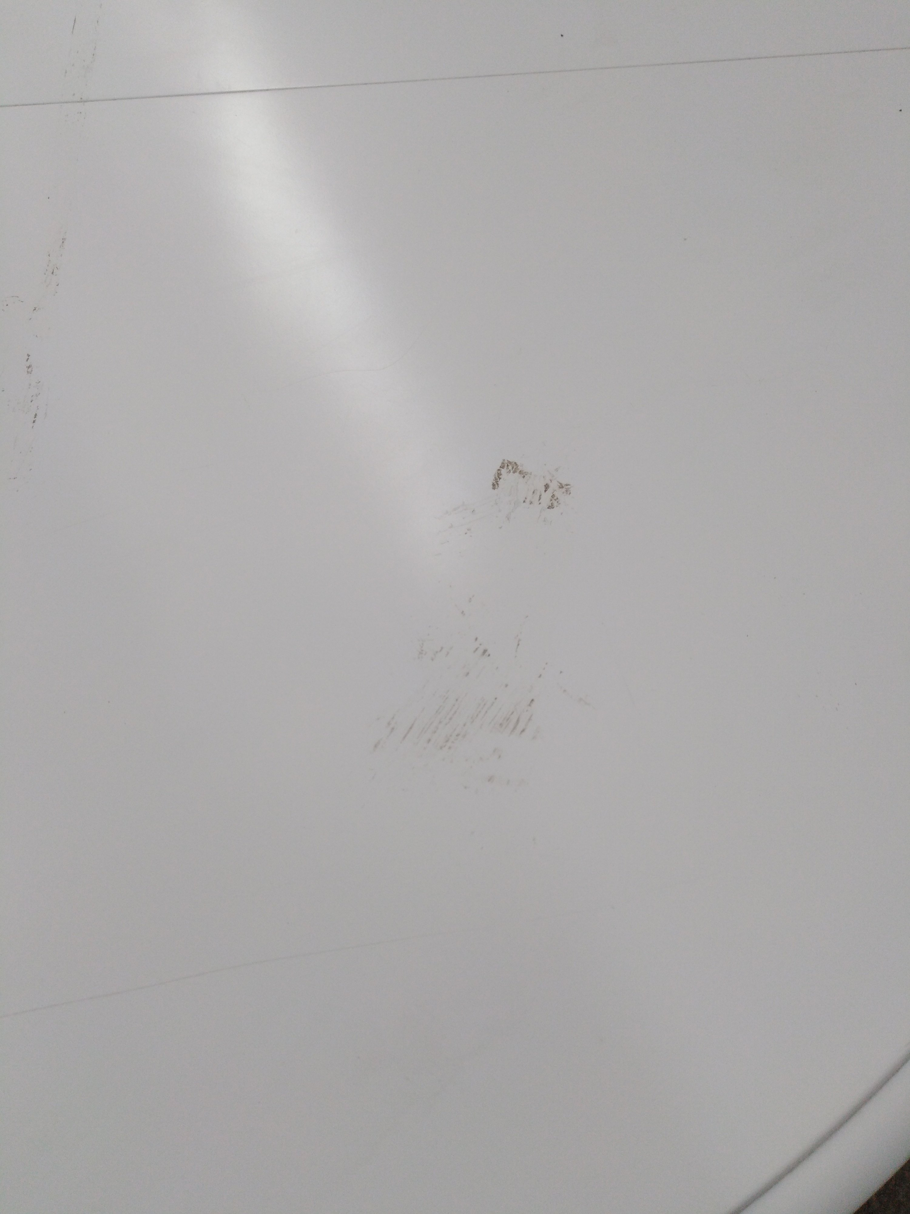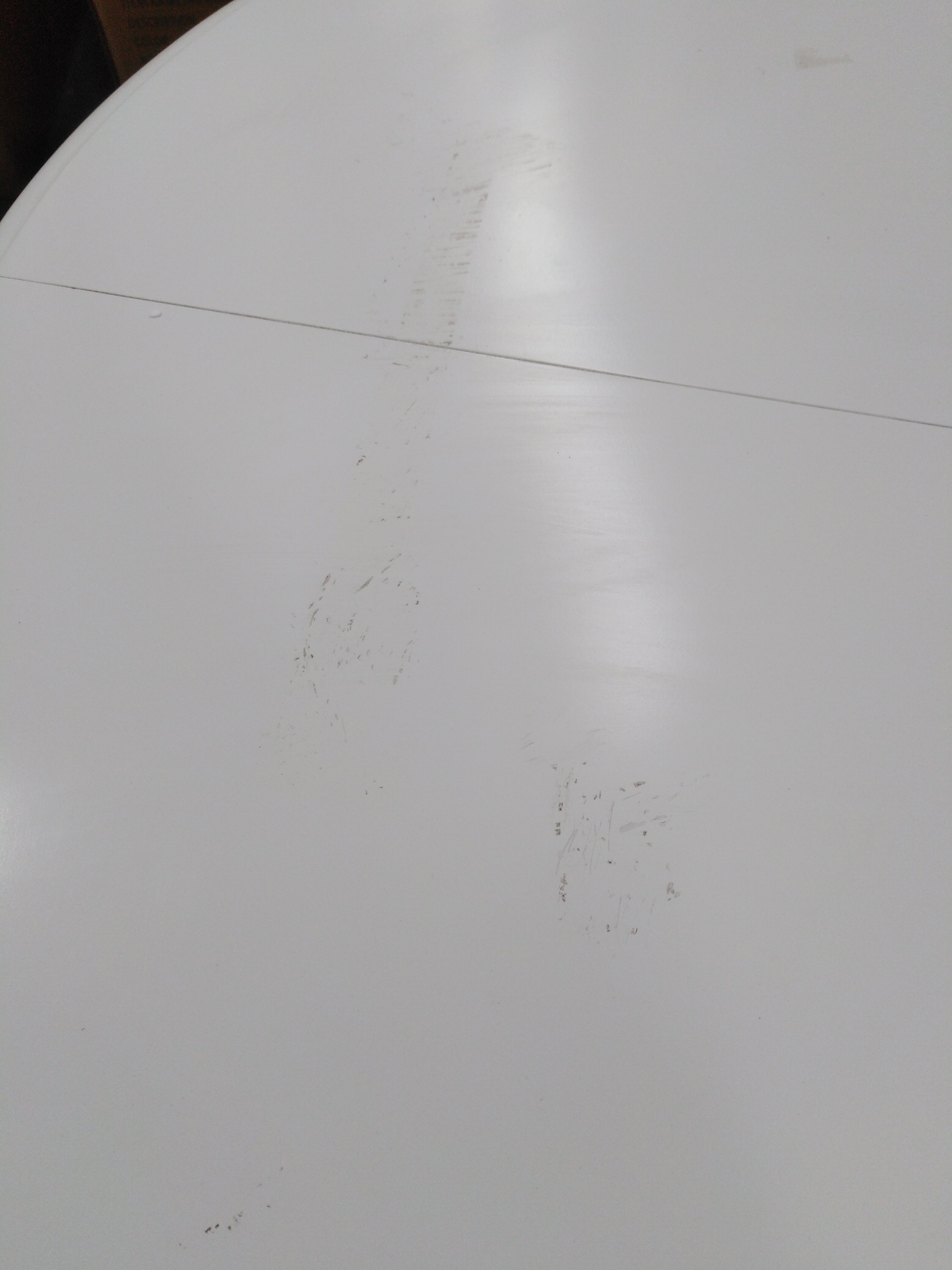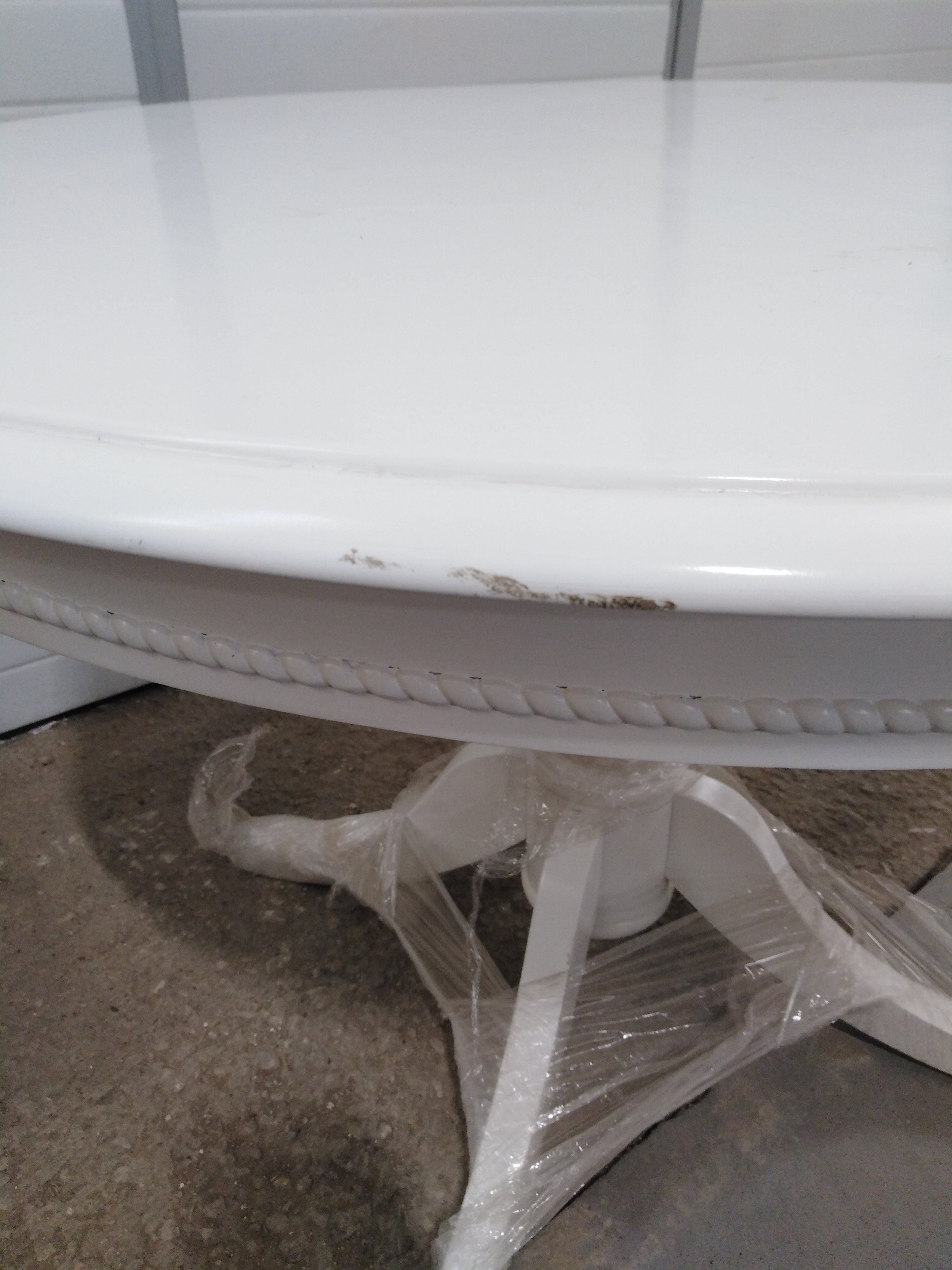 Описание дефекта: Нарушение ЛКП на юбке столешницы , на второй столешнице скол на кромке