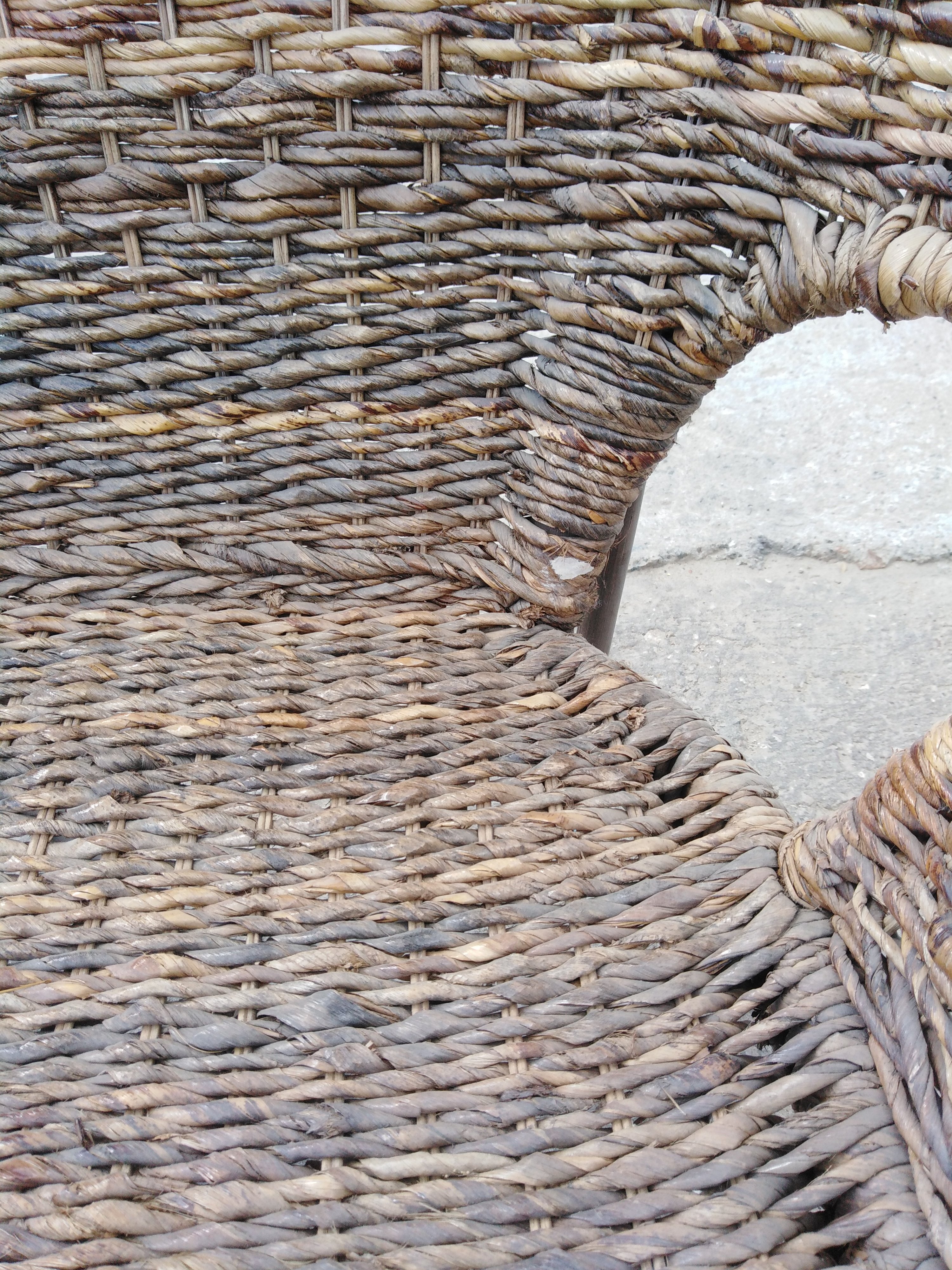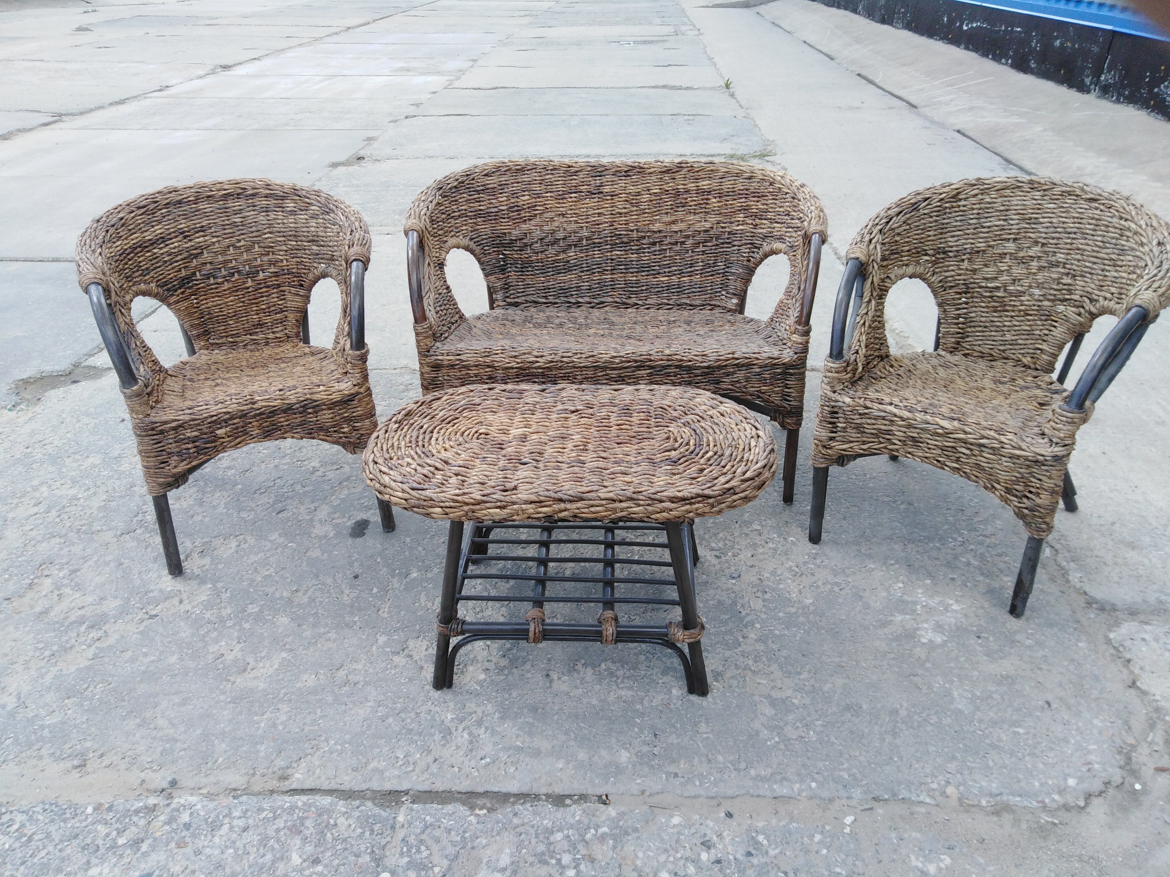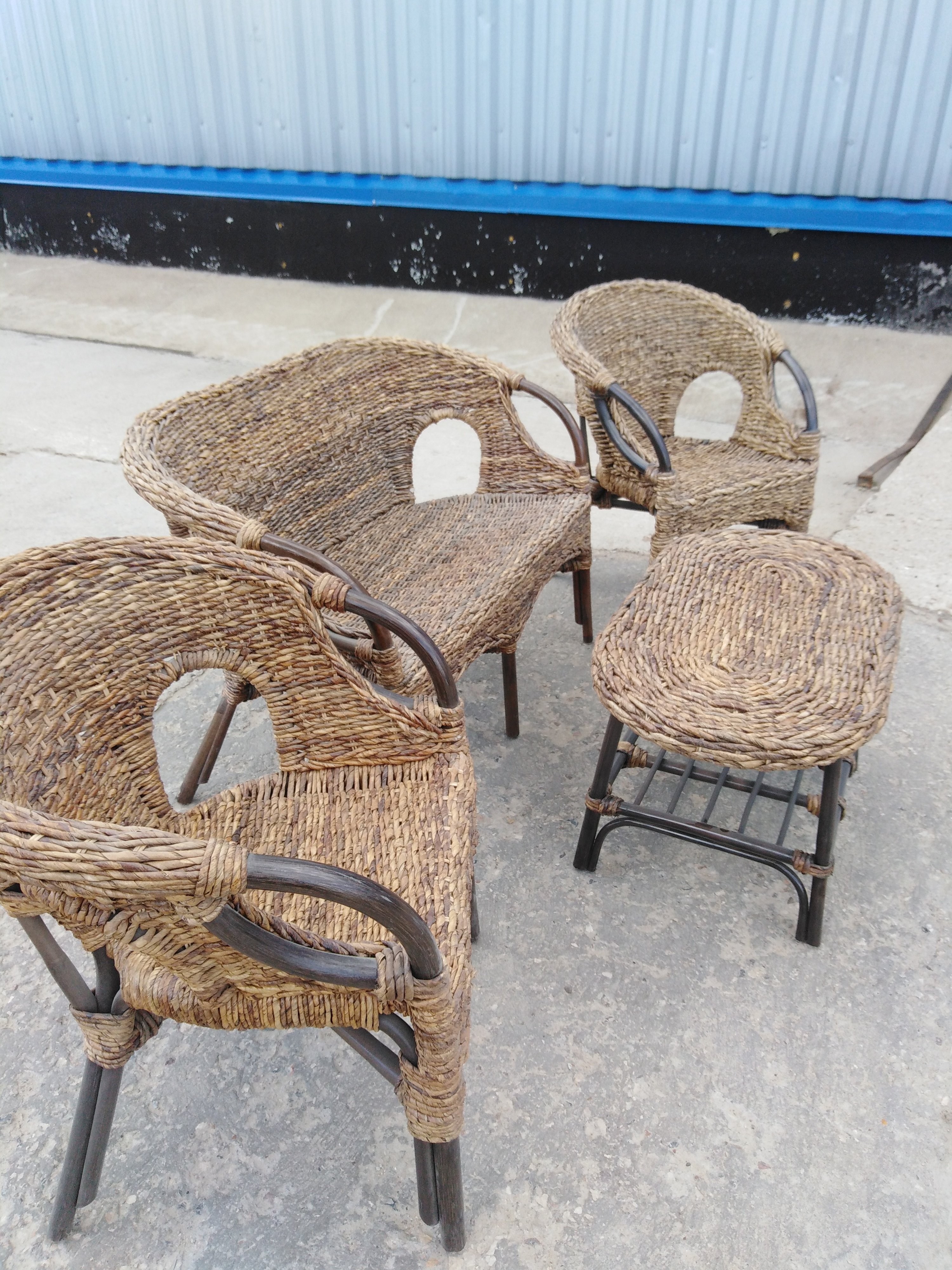 Описание товара без дефектов: Материал: каркас - натуральный ротанг (высший сорт), плетение - банановые листья. Цвет: walnut (грецкий орех). Размеры: кресло - 65х62х80 см, диван - 110х62х80 см, столик - 48х48х80 см