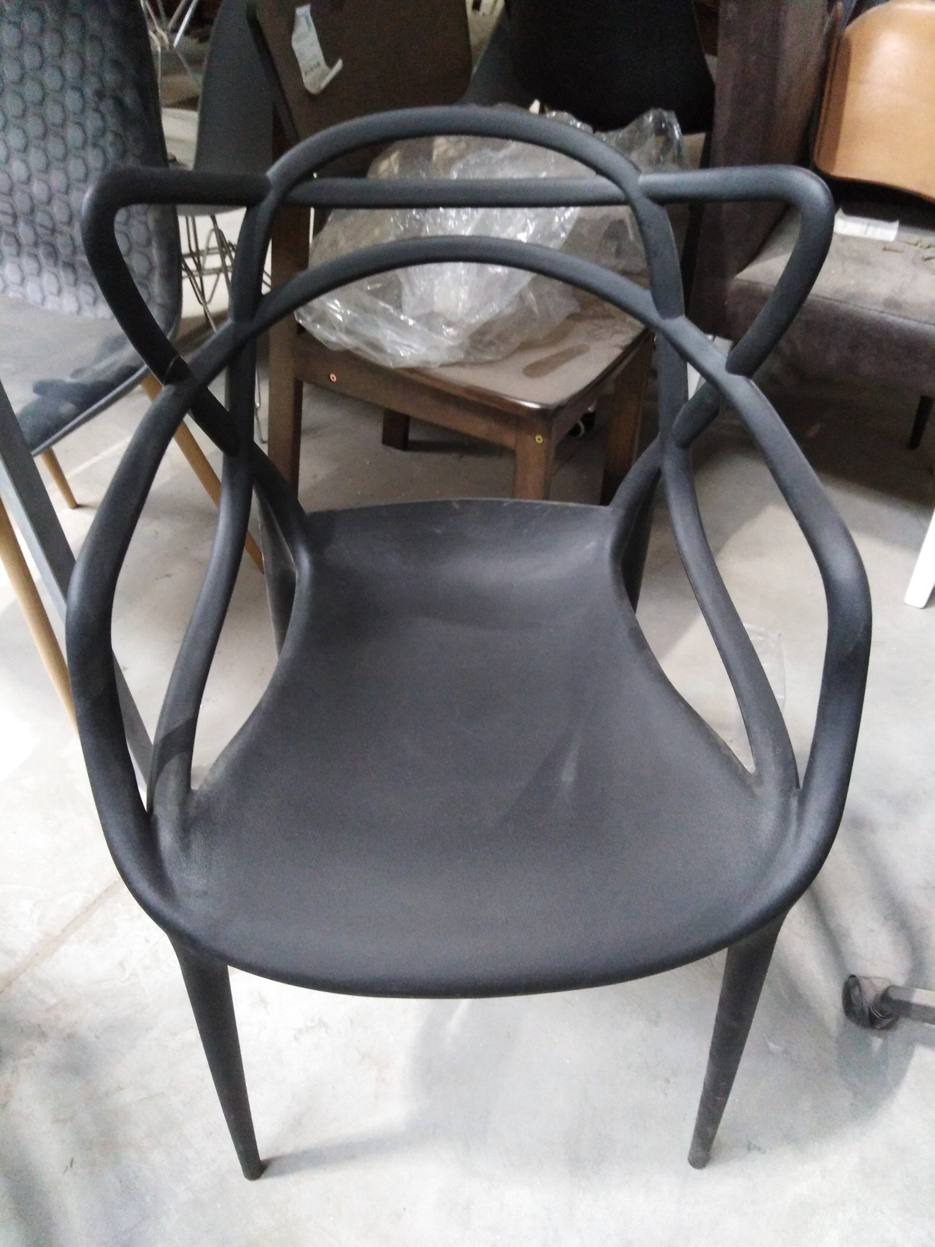 Описание товара без дефектов: Оригинальный дизайн стула Cat Chair/Кет Чаир из коллекции Modern/Модерн вдохновлен творением французского дизайнера Филиппа Старка, который совместно с Евгением Куитлитом разработал пластиковый стул Masters/Мастерс. Дизайнеры создали удачное сочетание трех знаменитых моделей стульев двадцатого века в одном, они объединили стул Series 7 от Арне Якобсена, кресло Tulip/Тюлип Ээро Сааринена и стул Eiffel/Эйфель Чарльза Имза. В итоге получился большой удобный стул с оригинальным дизайном. Стул Cat Chair/Кет Чаир станет незаменимым предметом интерьера на загородной террасе, приусадебном участке, веранде ресторана или кафе. Удобное сиденье и спинка позволяют комфортно сидеть в течение длительного времени. Стулья Cat Chair/Кет Чаир можно штабелировать, что позволяет экономить место при хранении. Сиденье стула выполнено из прочного пластика черного цвета, благодаря чему модель практична, надежна, способна выдерживать большие нагрузки, устойчива к воздействию влаги, температурным перепадам и проста в уходе. Для вашего удобства на сиденье можно дополнительно приобрести декоративную подушку из нашей коллекции текстиля. Стул хорошо подойдет для гостиной, для кухни, для террасы, для дачи, для ресторана или для кафе. Стул поставляется в собранном виде.
