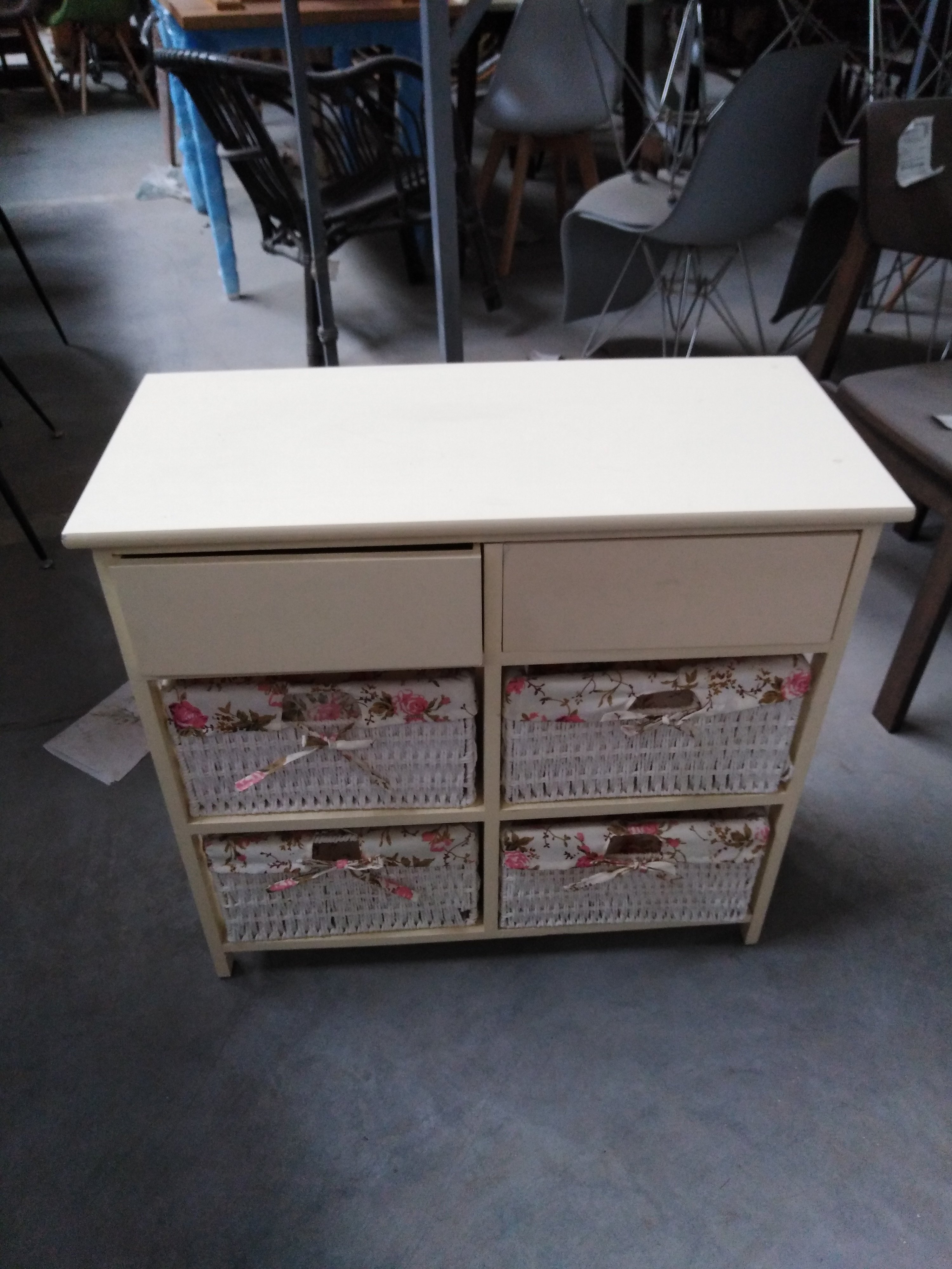 Описание товара без дефектов: Изящный комод Secret De Maison Banc/Бенк, выполненный в стиле прованс, наполнит ваш дом атмосферой французской деревенской жизни, подарит ощущение спокойствия и умиротворения. Изумительное сочетание прочного каркаса из массива павловнии, корзин из бумажного жгута, съемных тканевых чехлов с нежным цветочным принтом и фурнитуры в виде розы восхищает, удивляет и не оставит никого равнодушным. Два удобных выдвижных ящика и четыре корзины станут отличной системой для хранения множества предметов. Легкие плетеные корзины ручной работы можно использовать отдельно от комода, поставить в любой части комнаты и переместить при необходимости. Комод выполнен из массива павловнии, легкого и одновременно прочного материала, с хорошими водоотталкивающими свойствами, благодаря чему изделие долговечно, надежно и не требует специального ухода. Модель отлично сочетается с мебелью из коллекции Saint-Tropez/Сен-Тропе, поставляется в собранном виде.