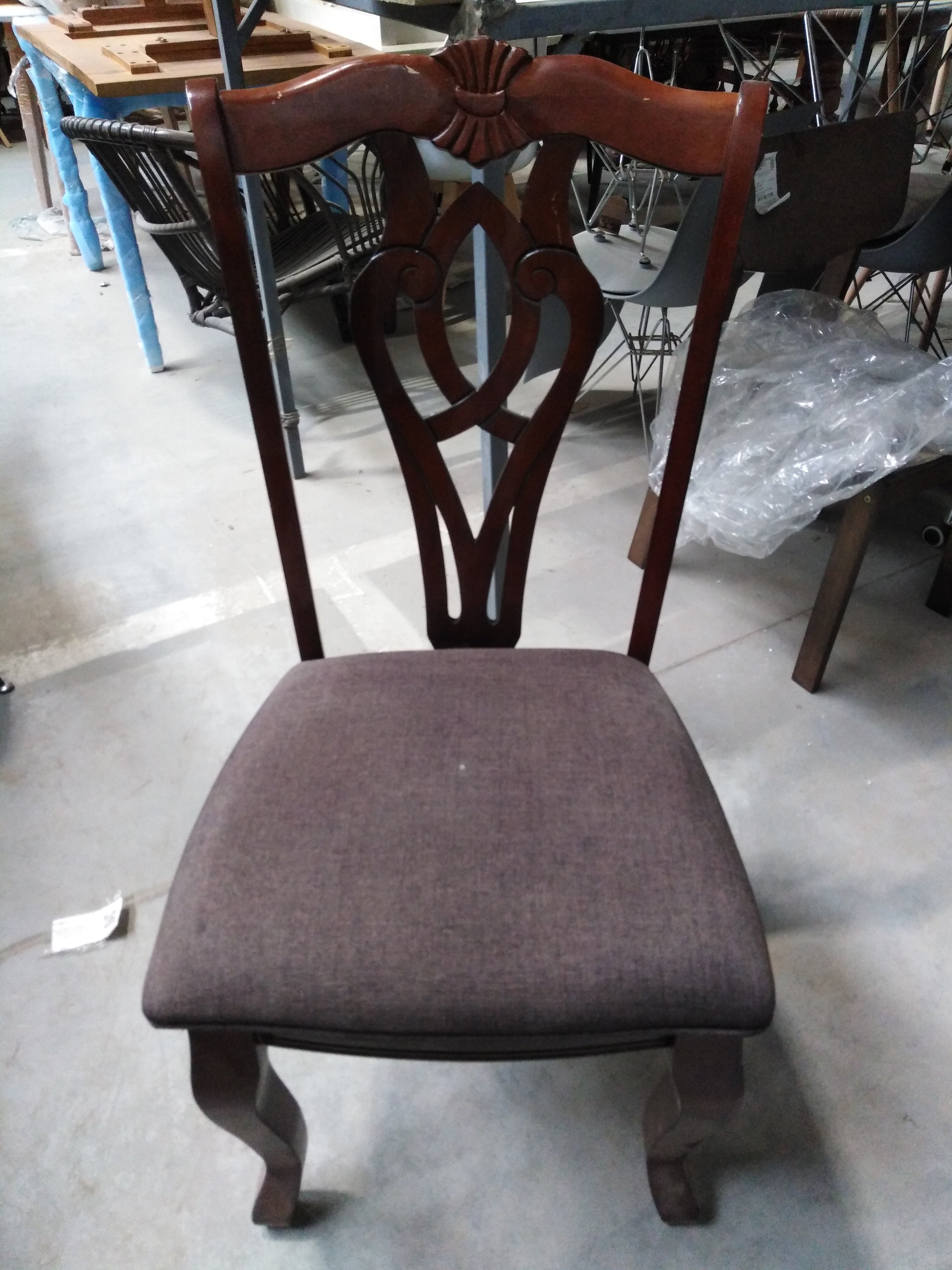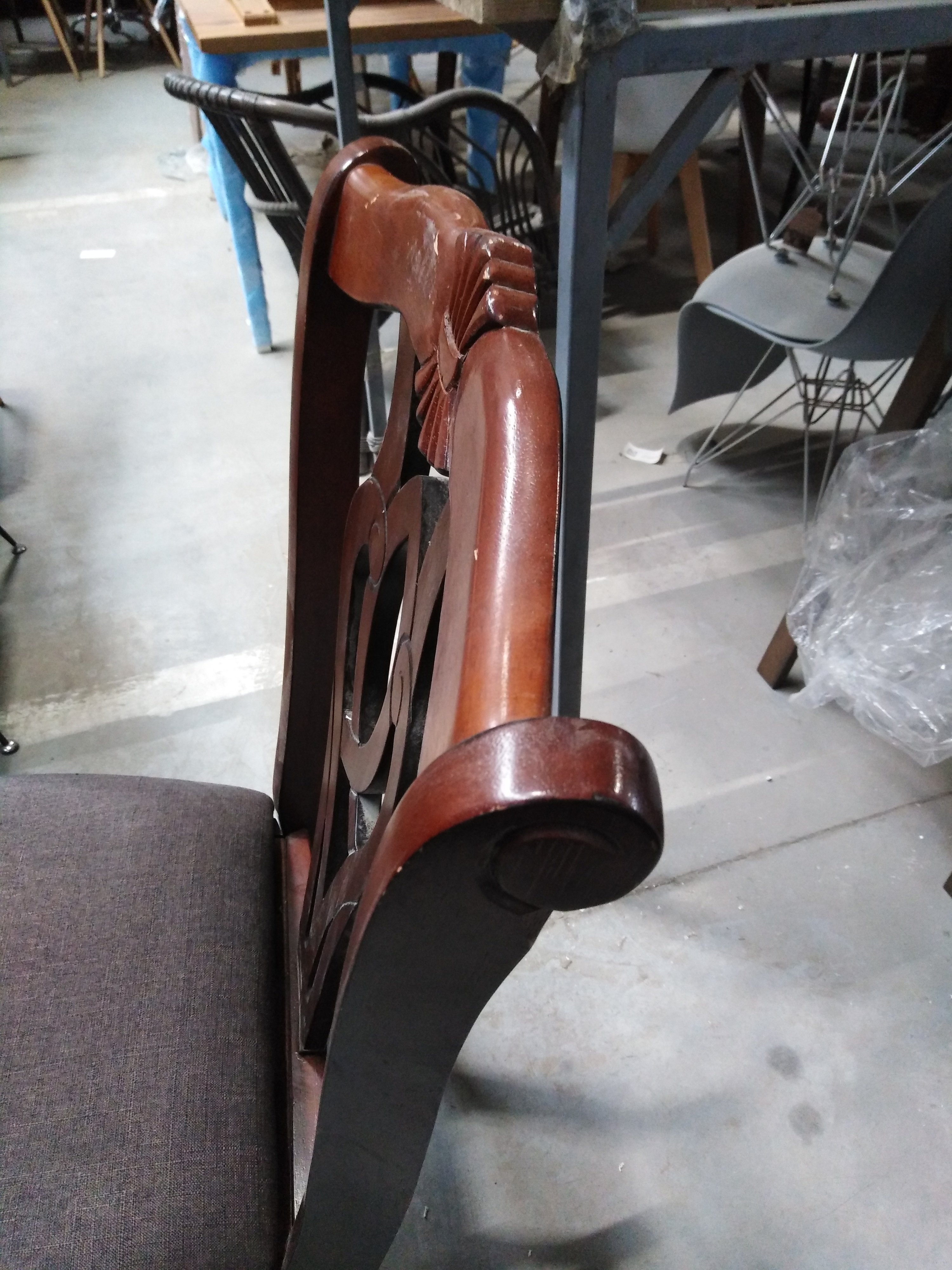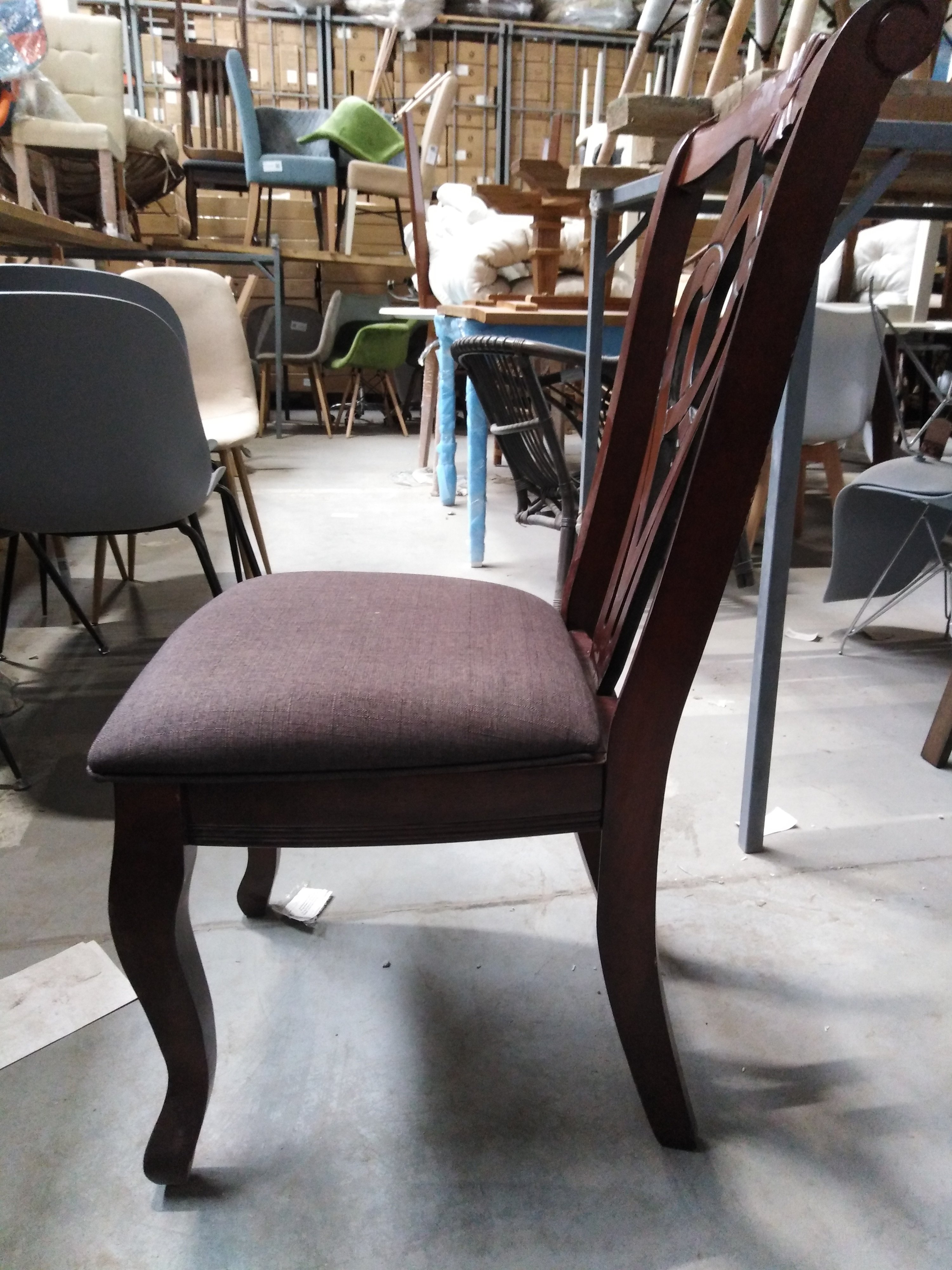 Описание товара без дефектов: Материал: каркас - дерево гевея, резная часть спинки - МДФ+шпон окумея, обивка - 100% полиестер. Цвет: каркас - dark brown, обивка - светло-коричневый. Размеры: 52,5х57х103 см., высота сиденья - 49 см