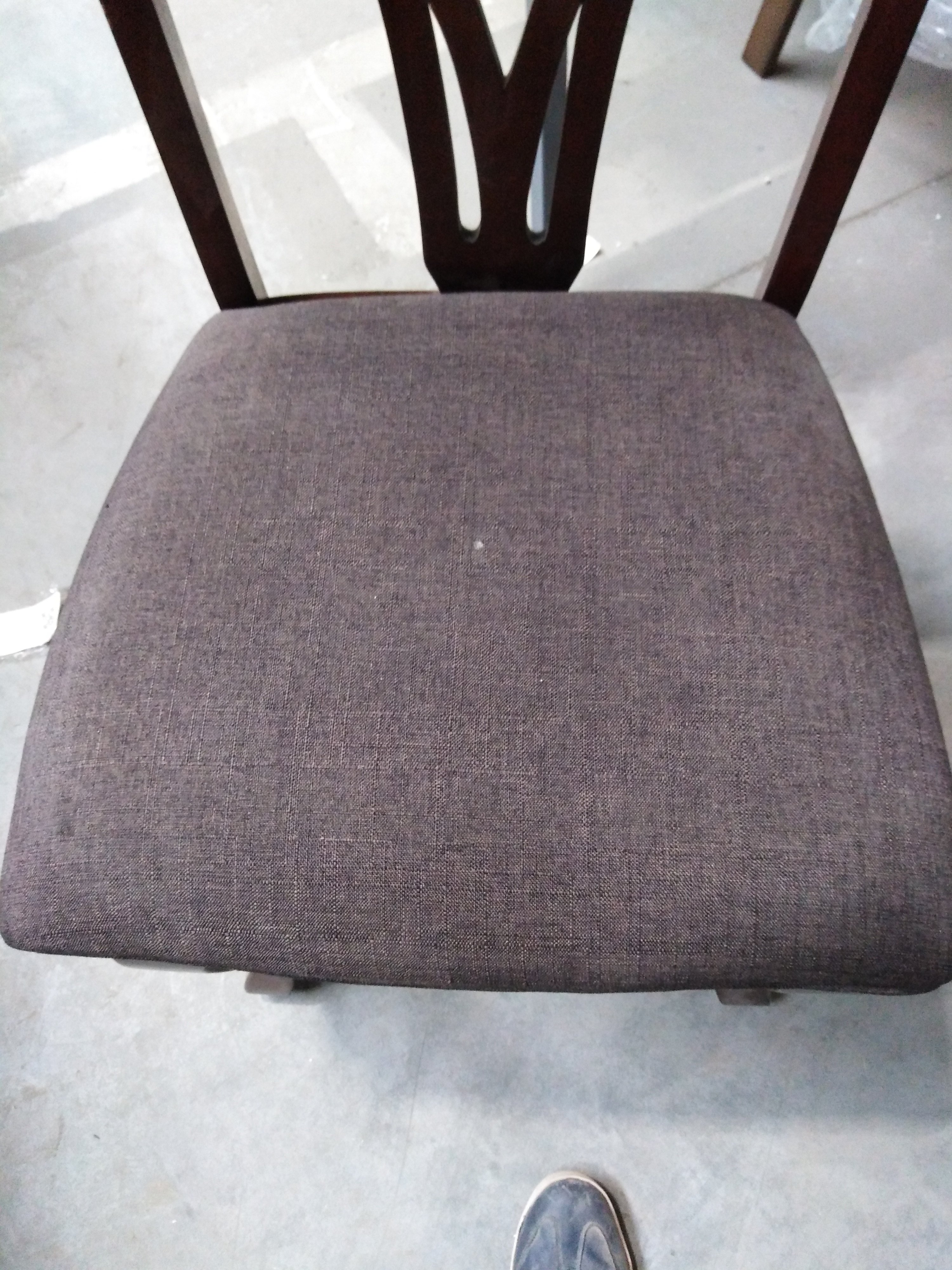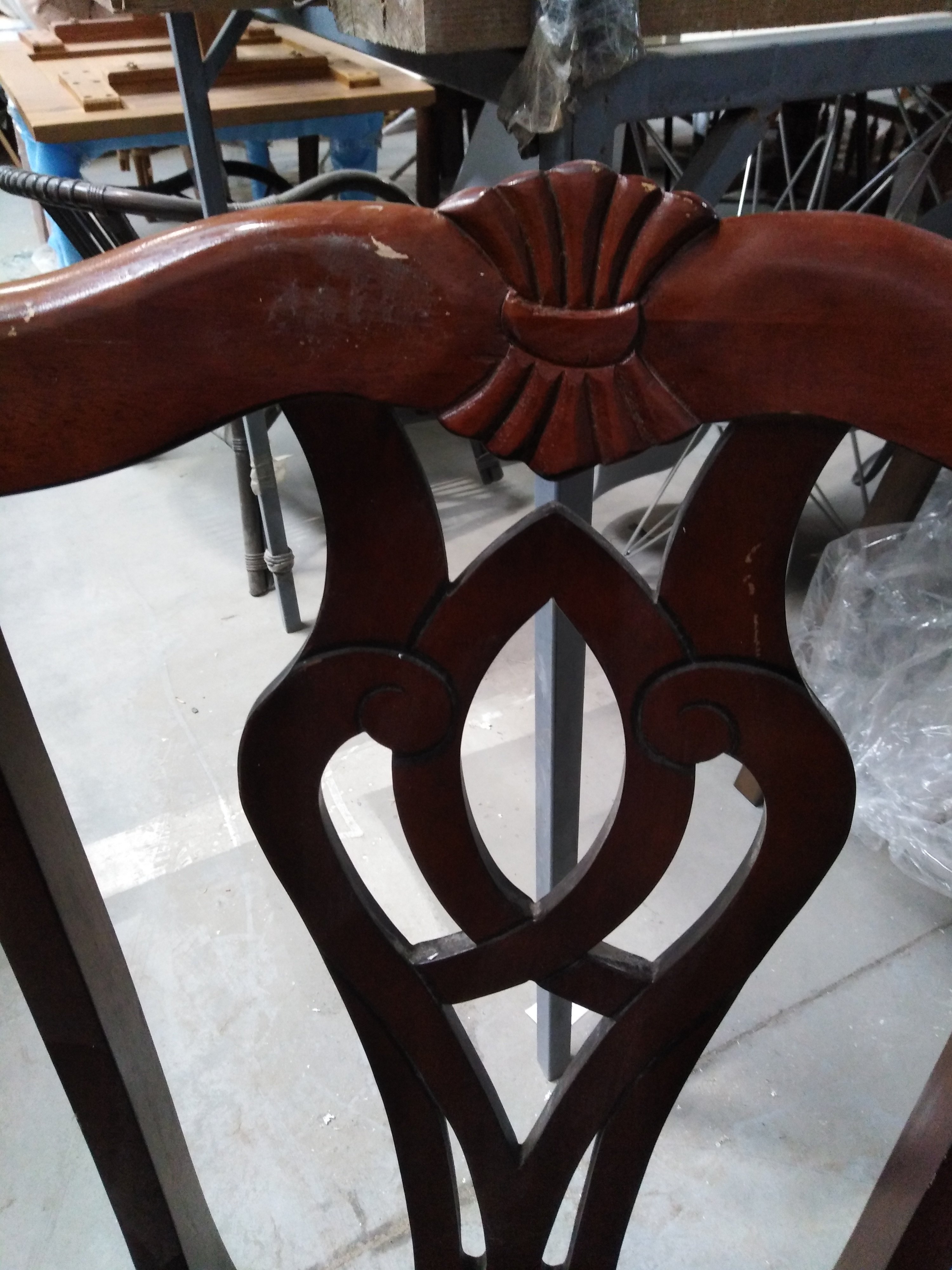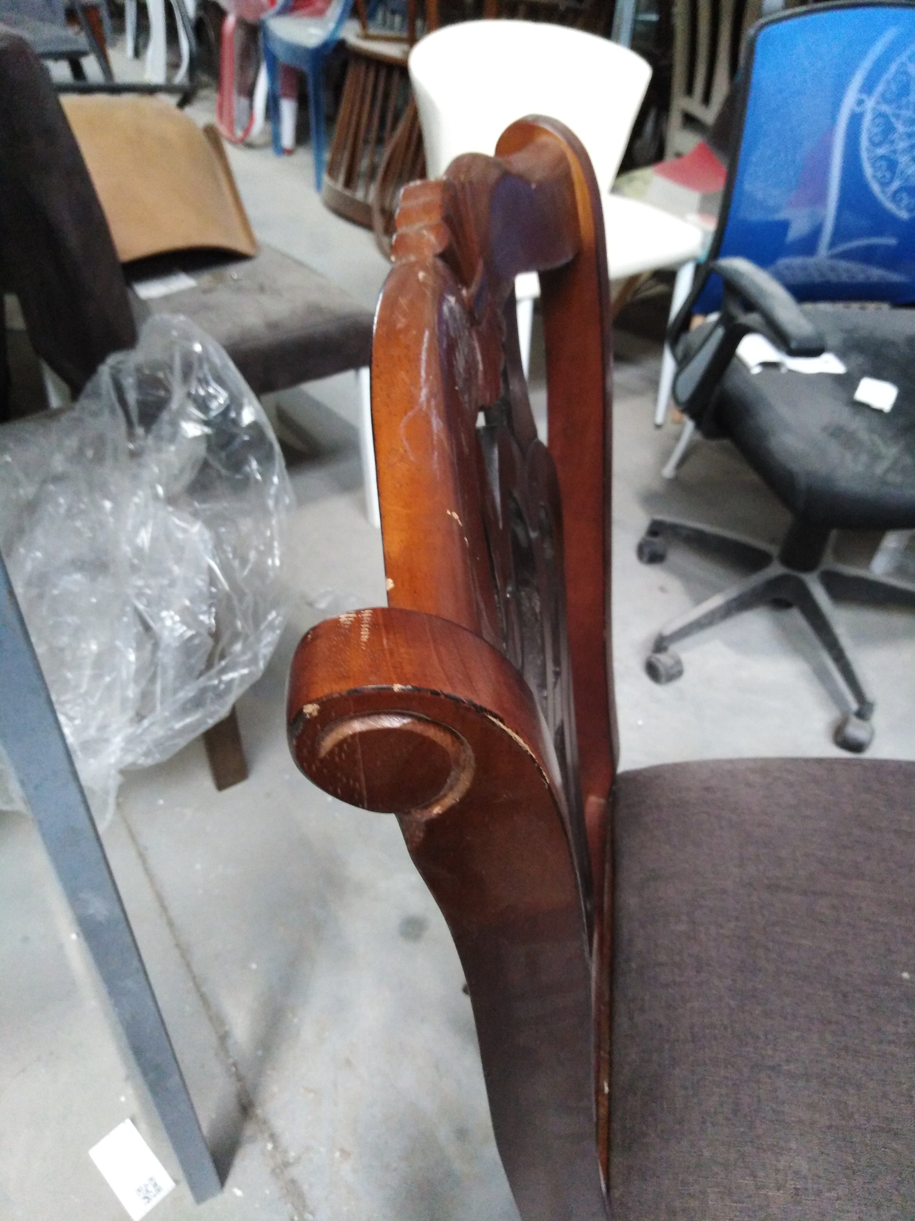 Описание товара без дефектов: Материал: каркас - дерево гевея, резная часть спинки - МДФ+шпон окумея, обивка - 100% полиестер. Цвет: каркас - dark brown, обивка - светло-коричневый. Размеры: 52,5х57х103 см., высота сиденья - 49 см