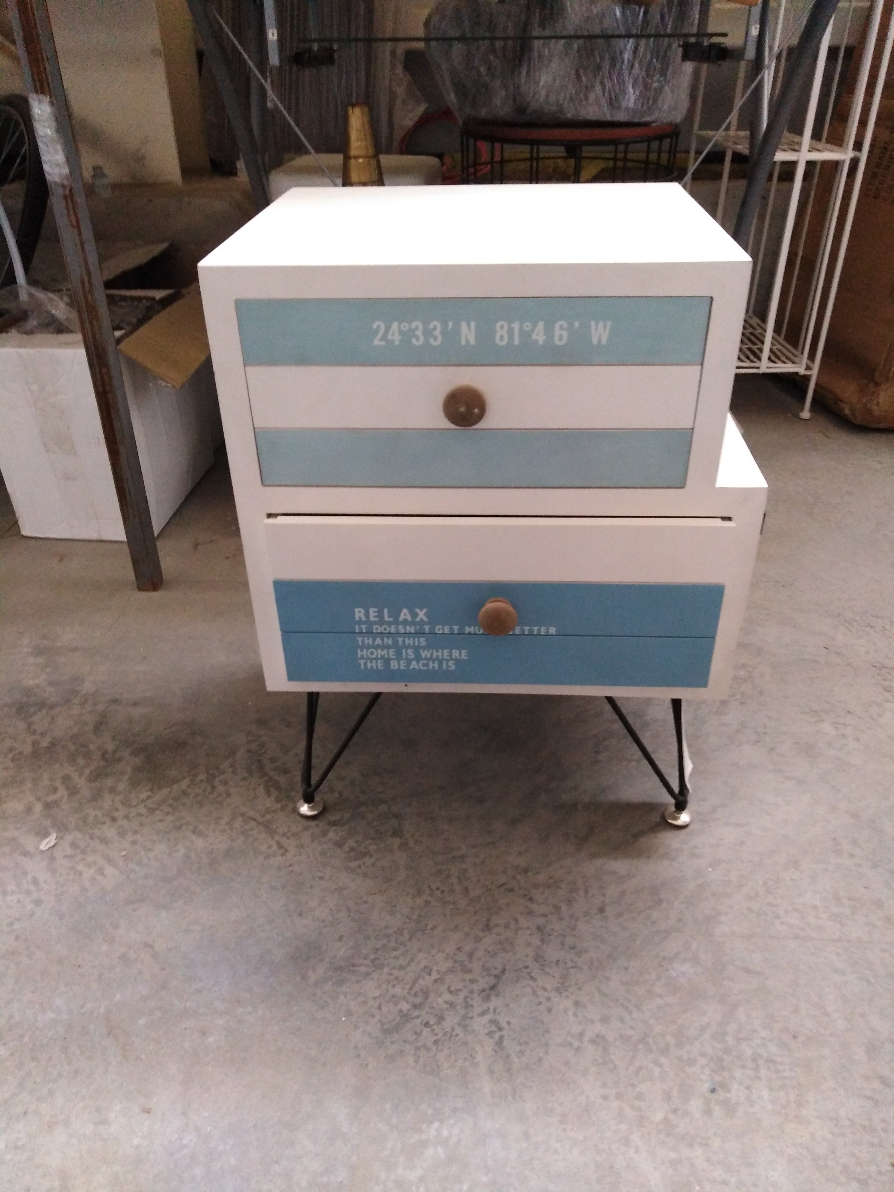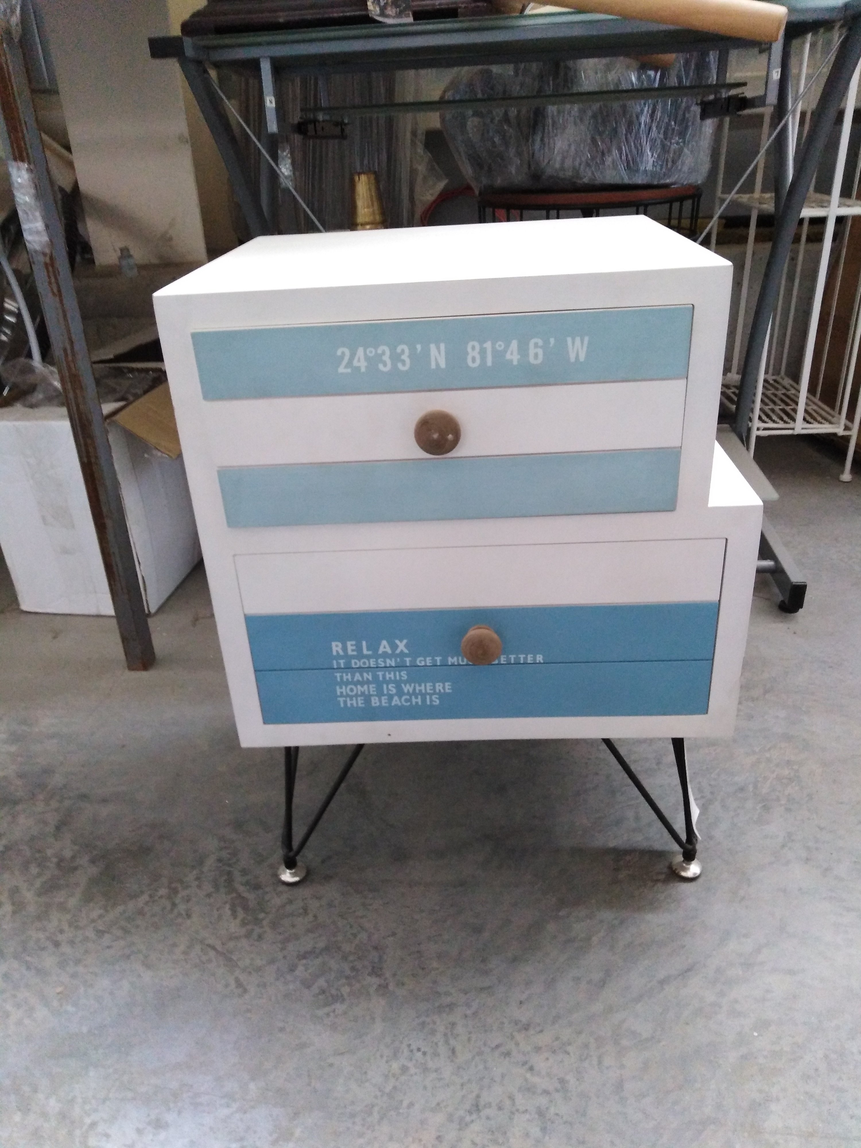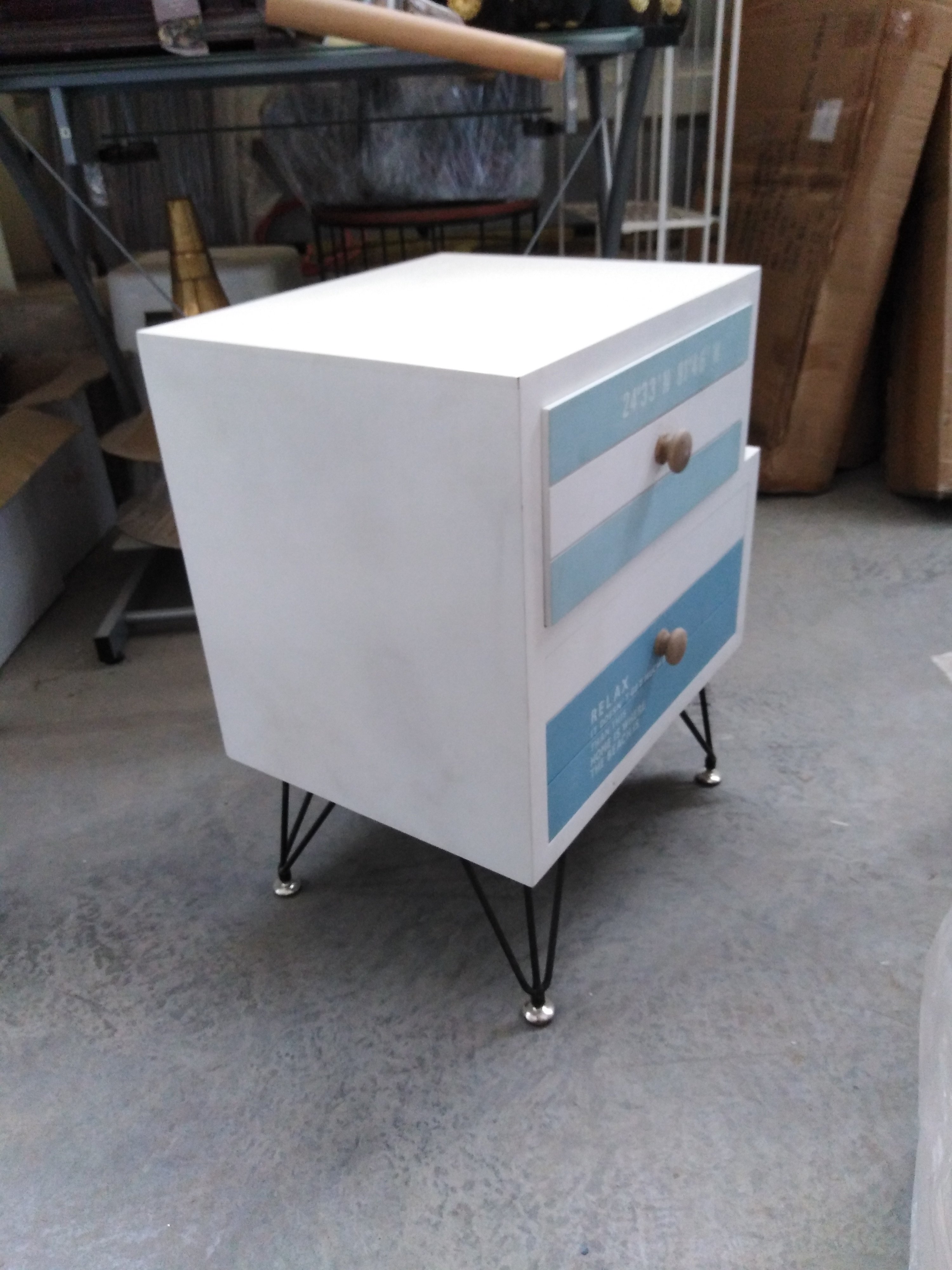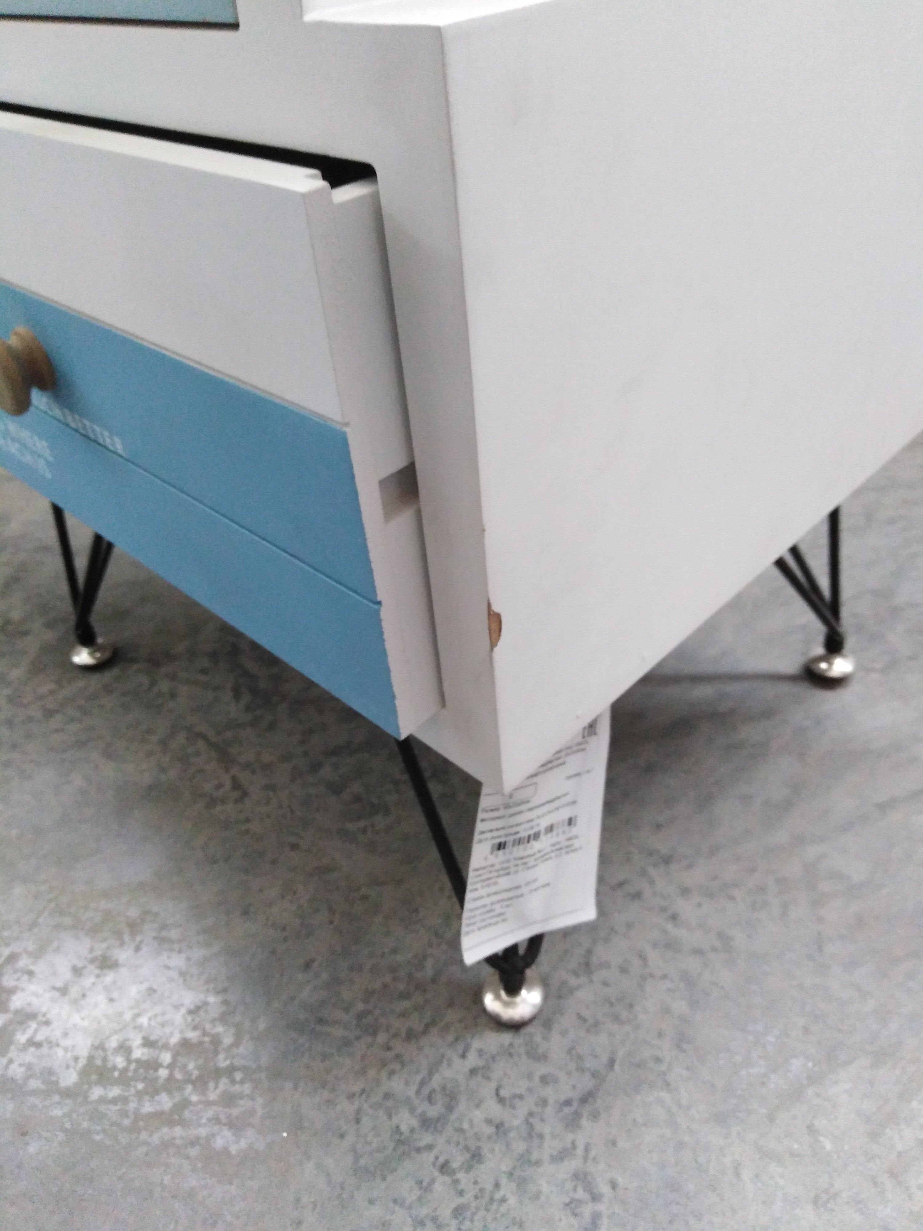 Описание товара без дефектов: Материал: ножки - металл, корпус - дерево павловния, МДФ. Цвет: ножки - чёрный, столешница - белый, голубой. Размер: 42х33х52 см