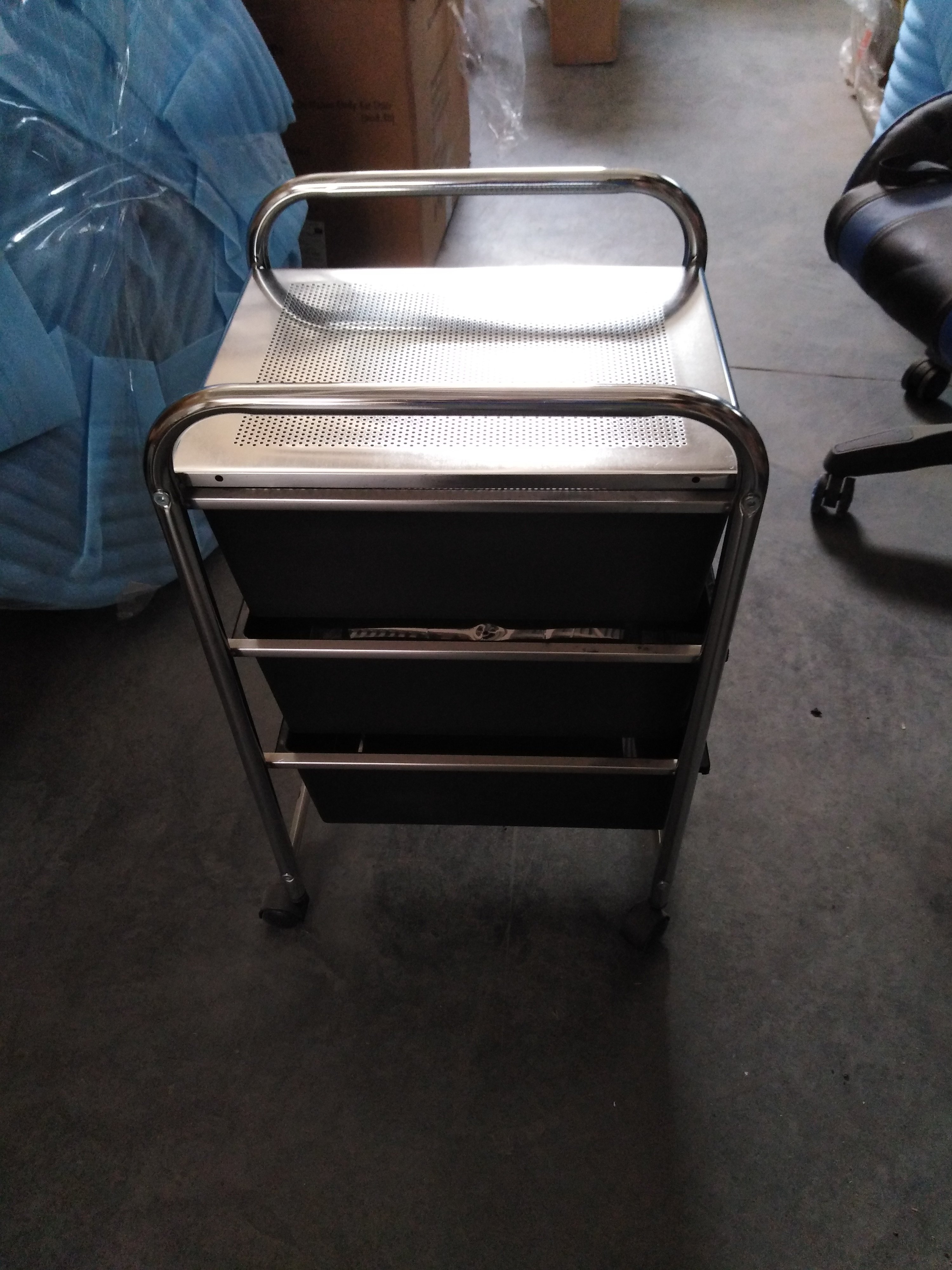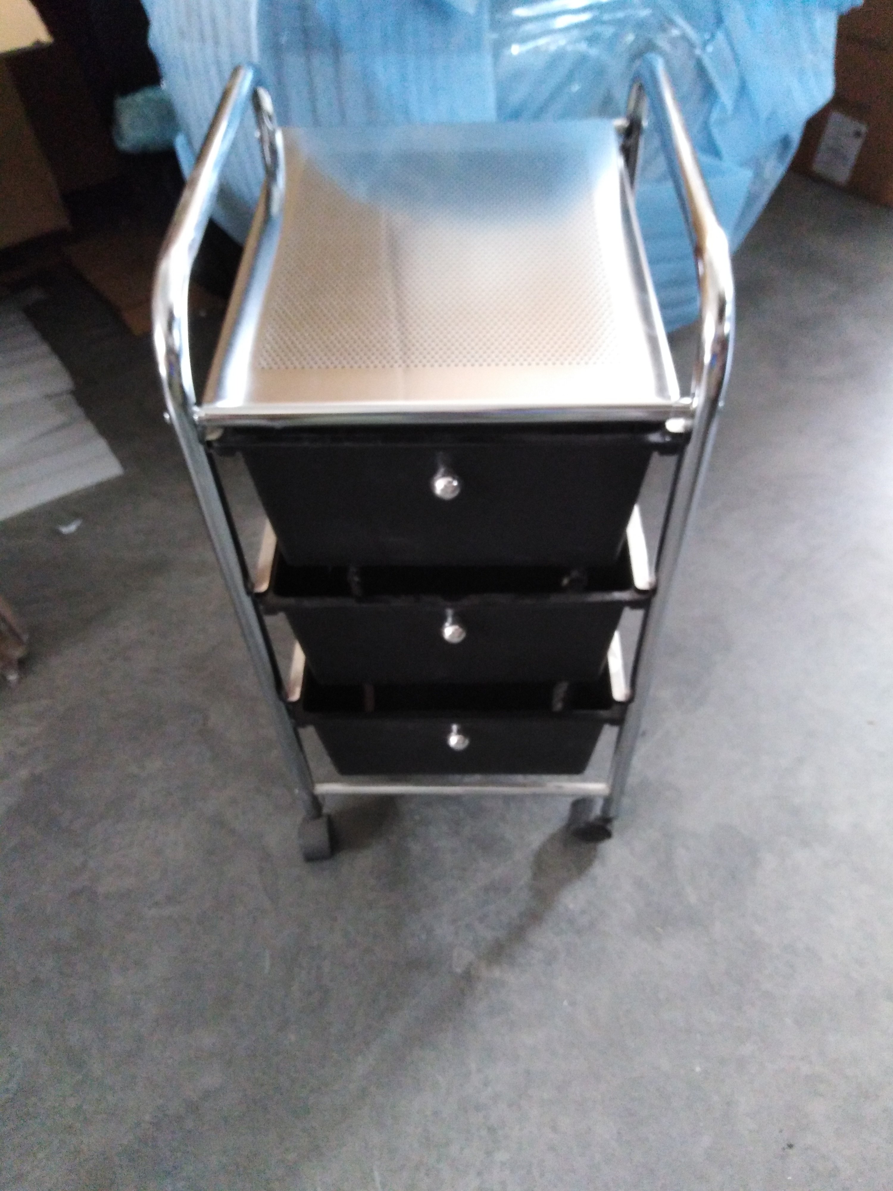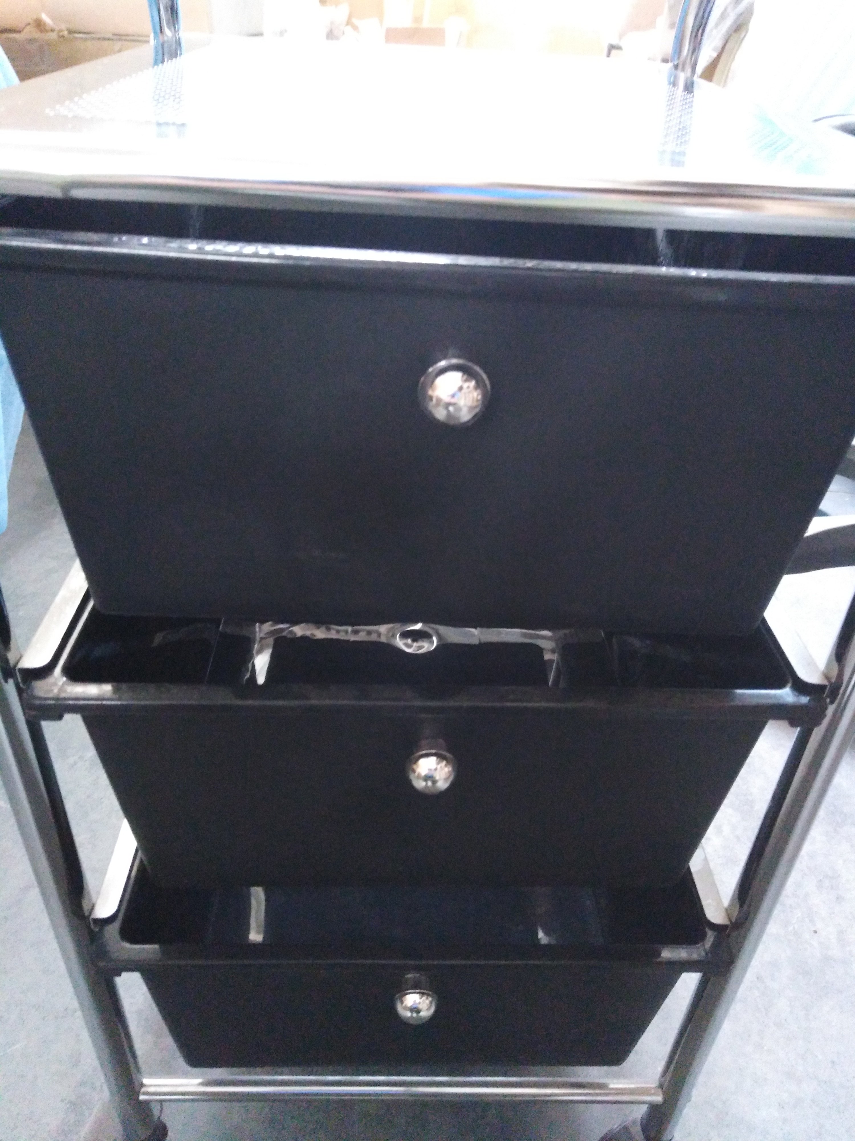 Описание товара без дефектов: Оригинальный столик с тремя ящиками для хранения из коллекции Уютный дом прекрасно впишется в интерьер вашей ванной, кухни, коридора, гардеробной комнаты, салона красоты или кабинета маникюра. Вместительные ящики изготовлены из прочного пластика. Такой материал имеет долгий срок службы, легко моется и не деформируется при воздействии жидкостей и тепла. В ящиках можно хранить полотенца, косметические средства и множество других нужных вещей. Столик оборудован колесиками, позволяющими легко перемещать его по дому или квартире. Основание модели изготовлено из металла. Благодаря этому столик устойчив, надежен и долговечен. Черные ящики и хромированное основание будут удачно сочетаться с другими элементами интерьера. Такая цветовая гамма создаст в комнате атмосферу уюта и комфорта. Элегантный столик c ящиками для хранения из коллекции Уютный дом станет отличным помощником, будет радовать вас своей компактностью, мобильностью и вместительностью долгие годы. Модель очень проста в сборке, инструкция по сборке прилагается.