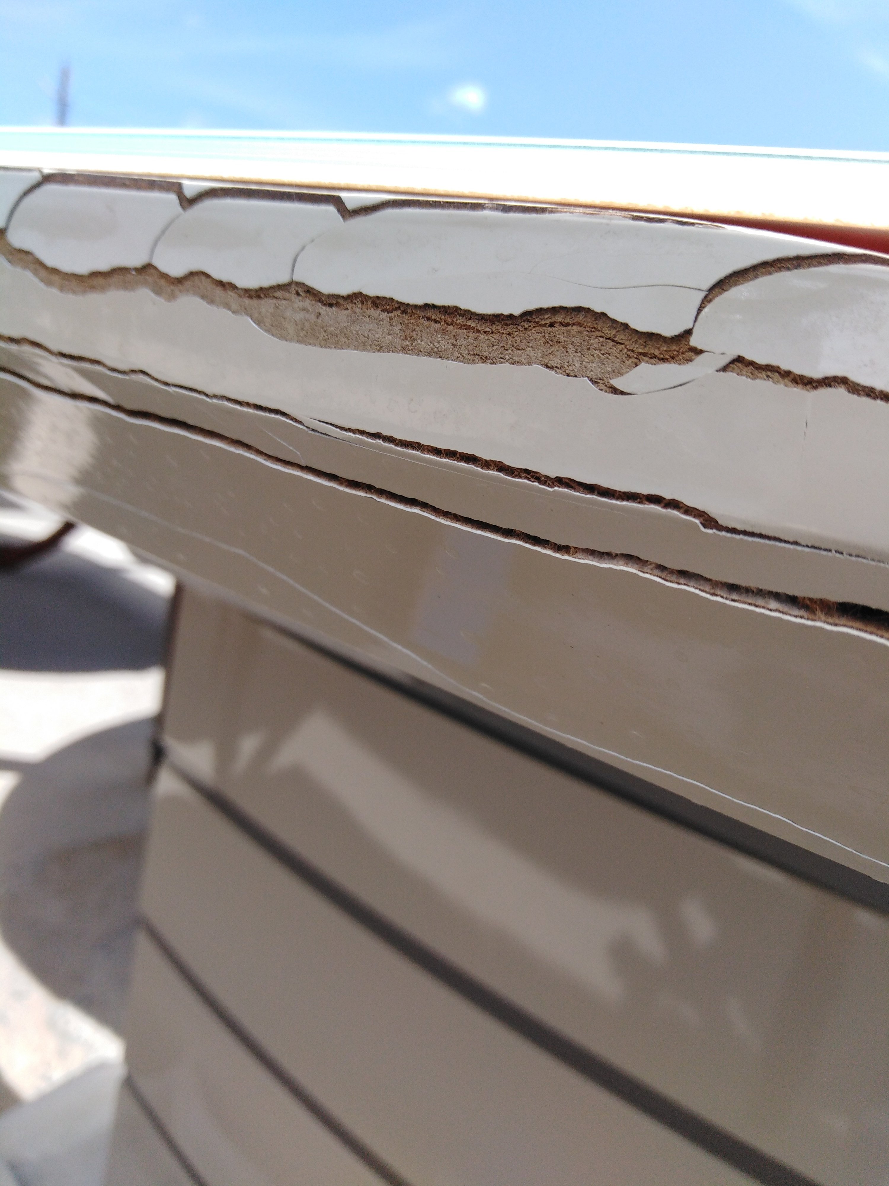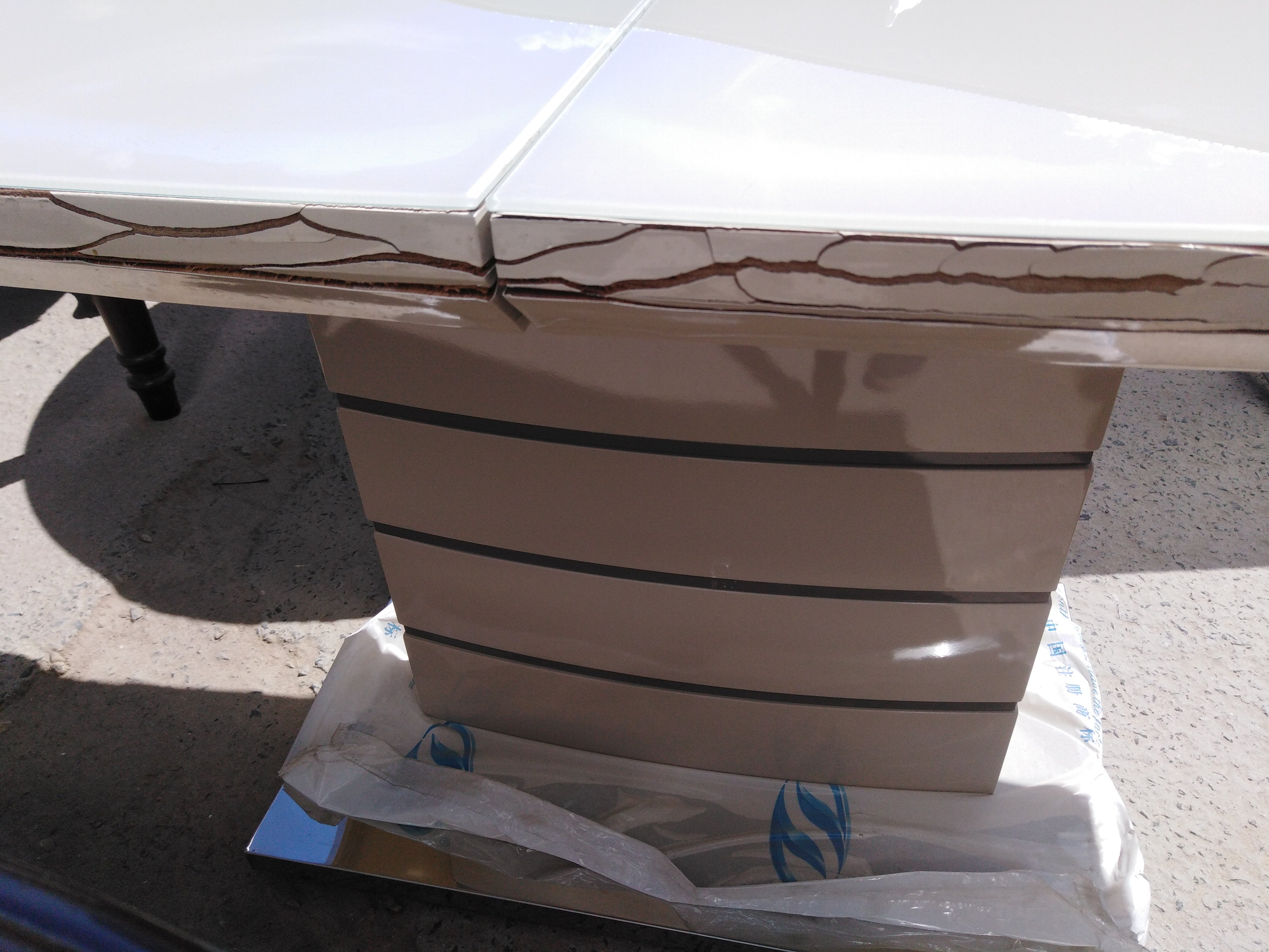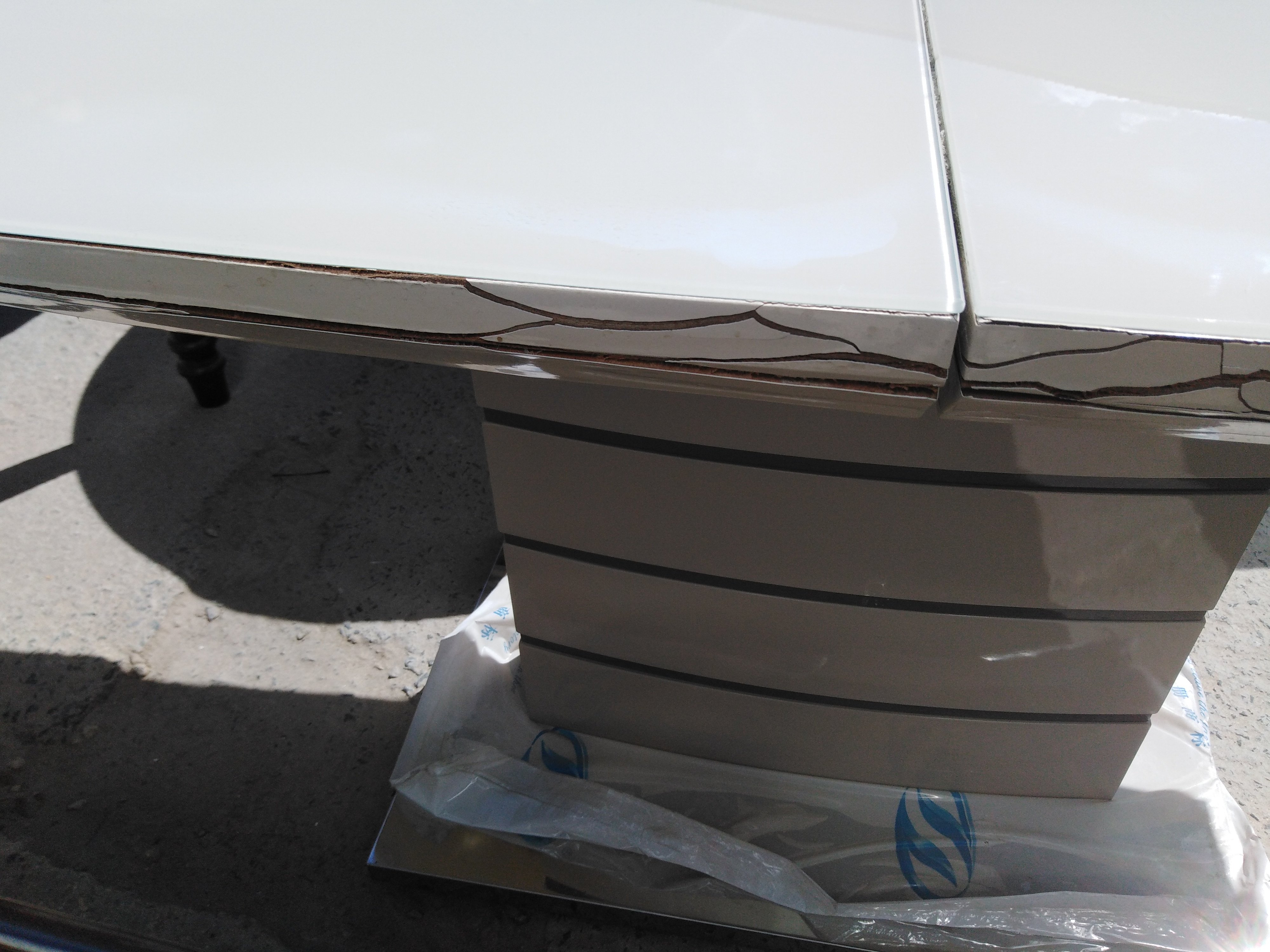 Описание дефекта: Нарушение ЛКП на столешнице. Большие трещины на юбке столешницы. Царапины и подтёки на нижней подставке