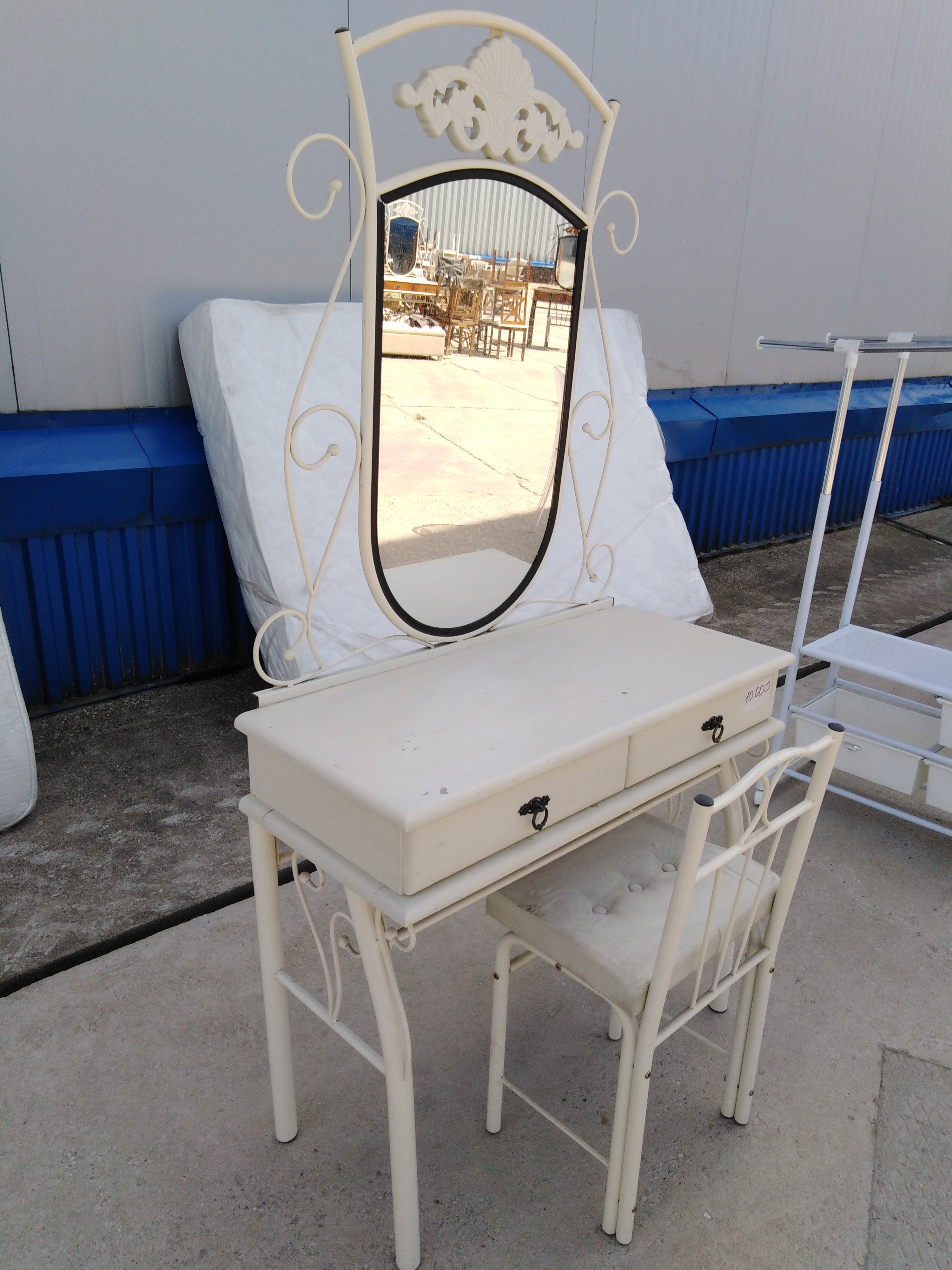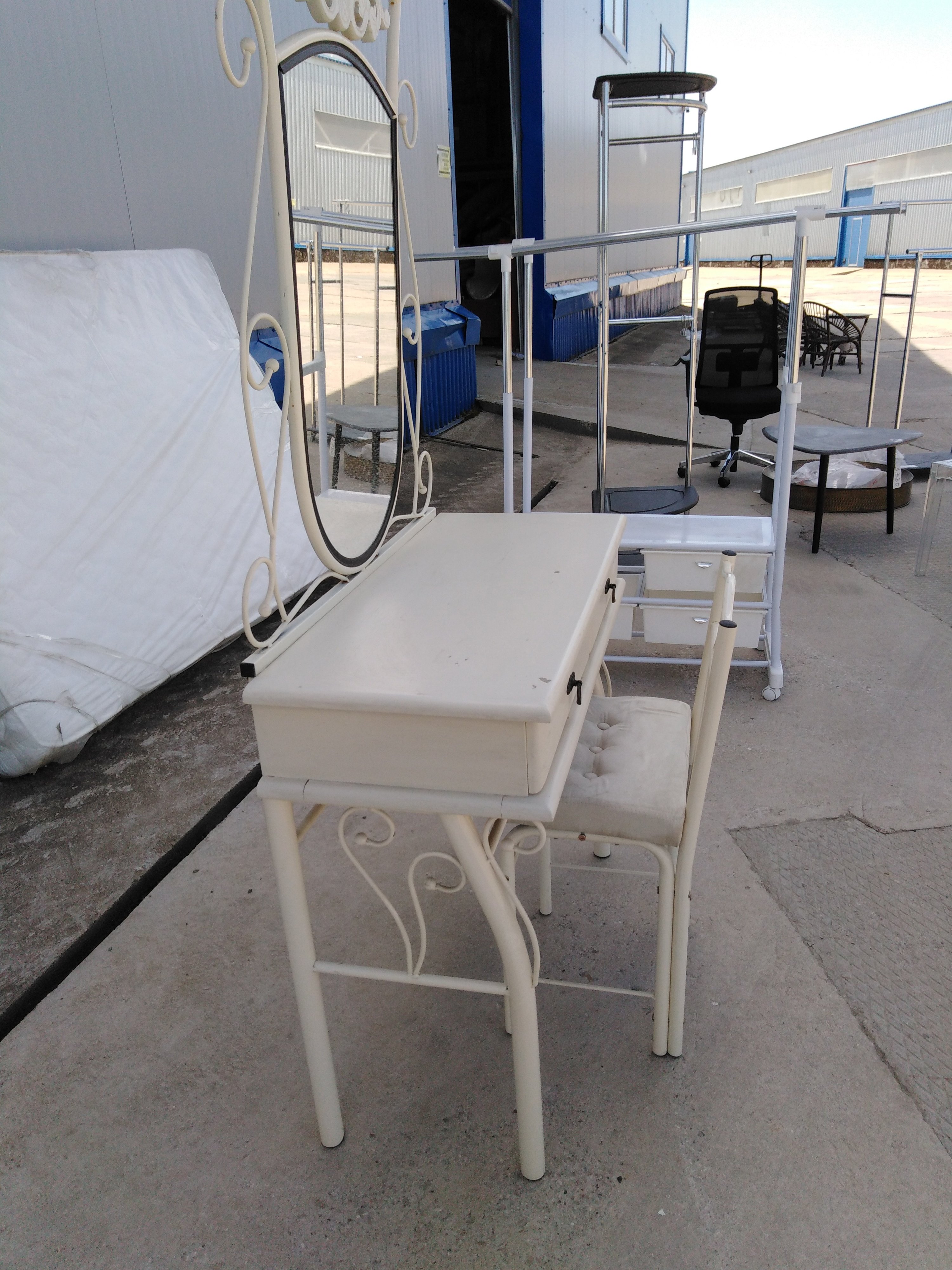 Описание товара без дефектов: Зеркало, 2 выдвижных ящика, стул с обивкой. Материал: каркас - металл; столешница, выдвижные ящики, элементы декора - дерево гевея и металл. Размеры: 95х46х16,2 см