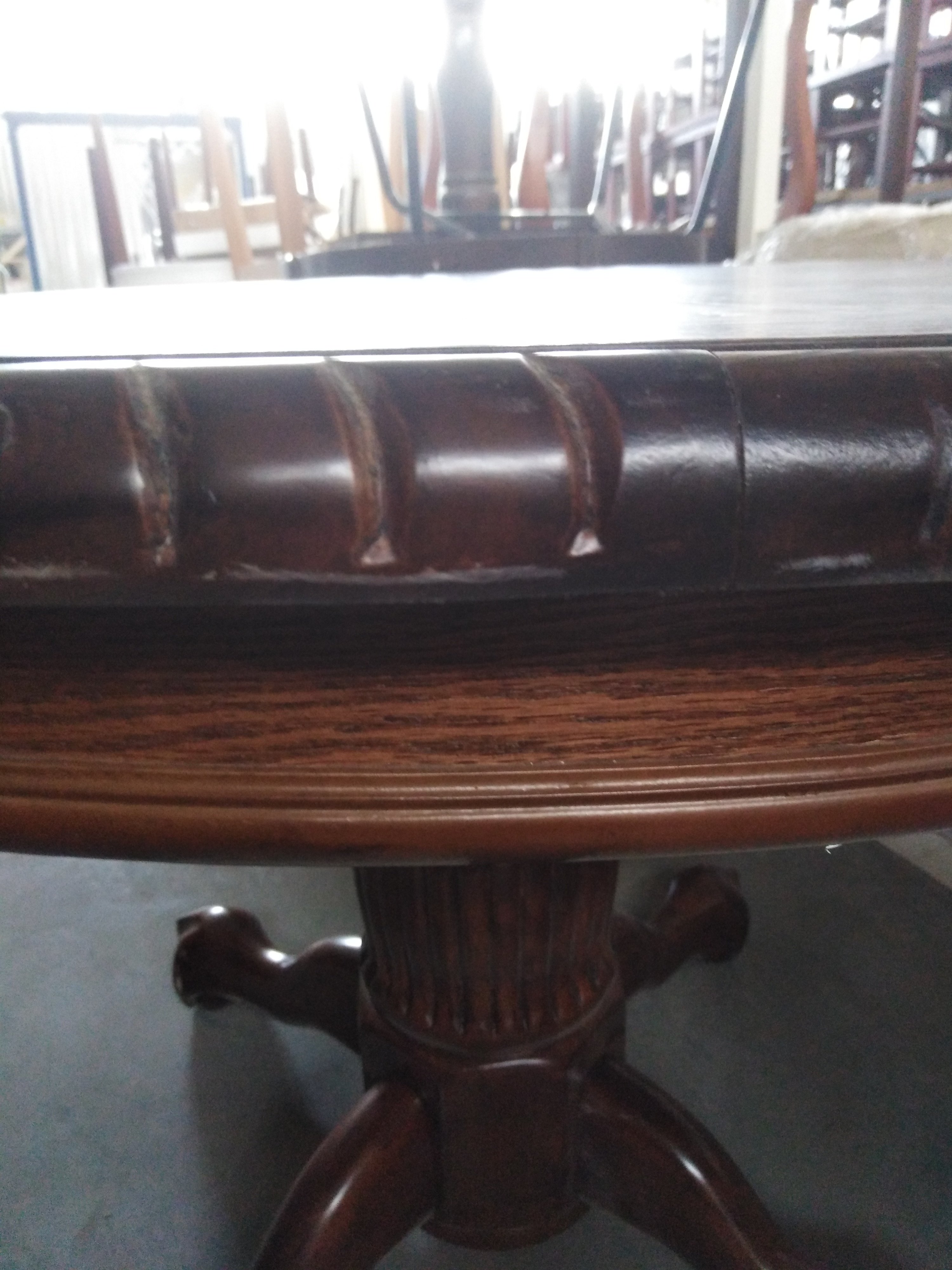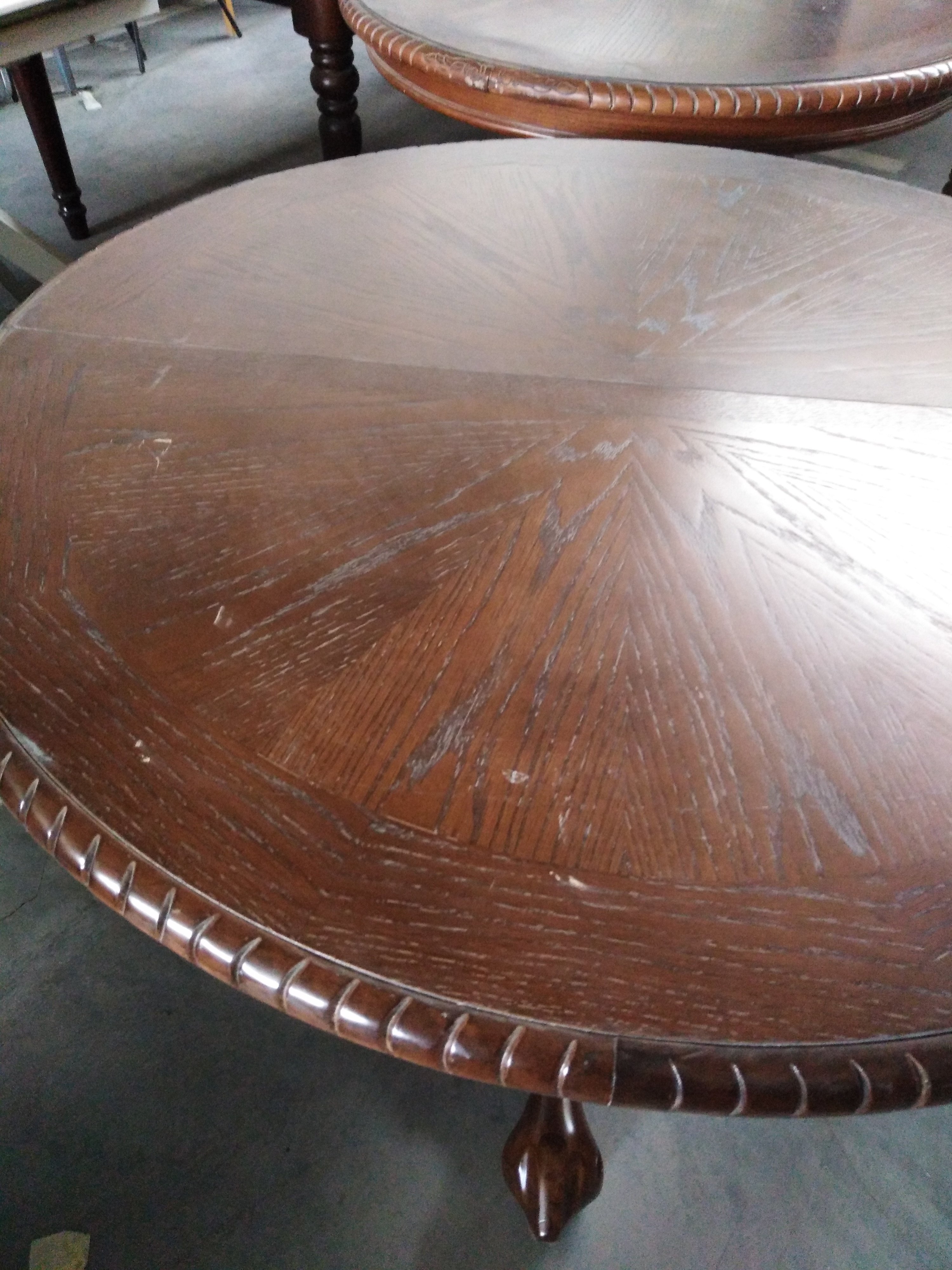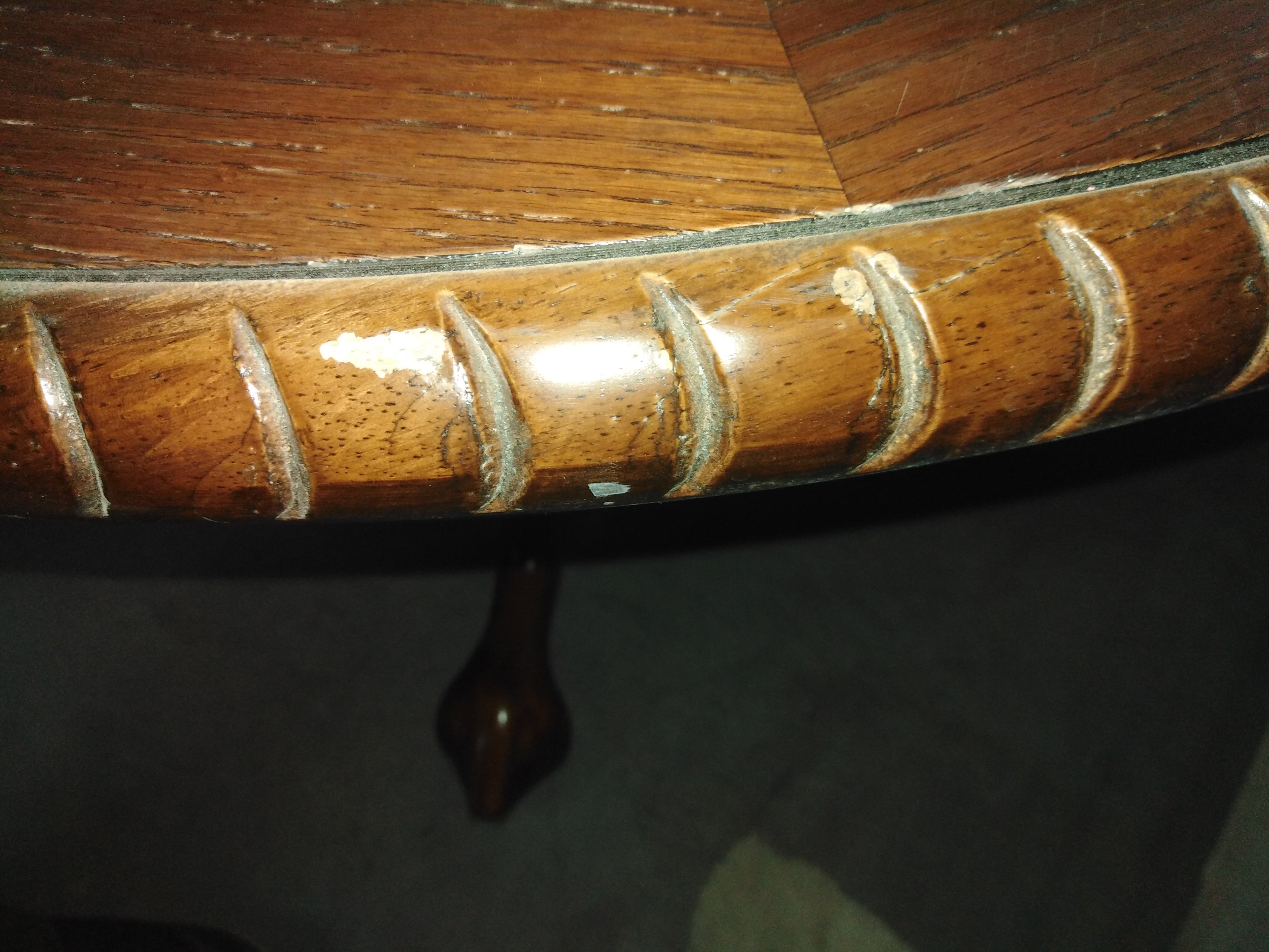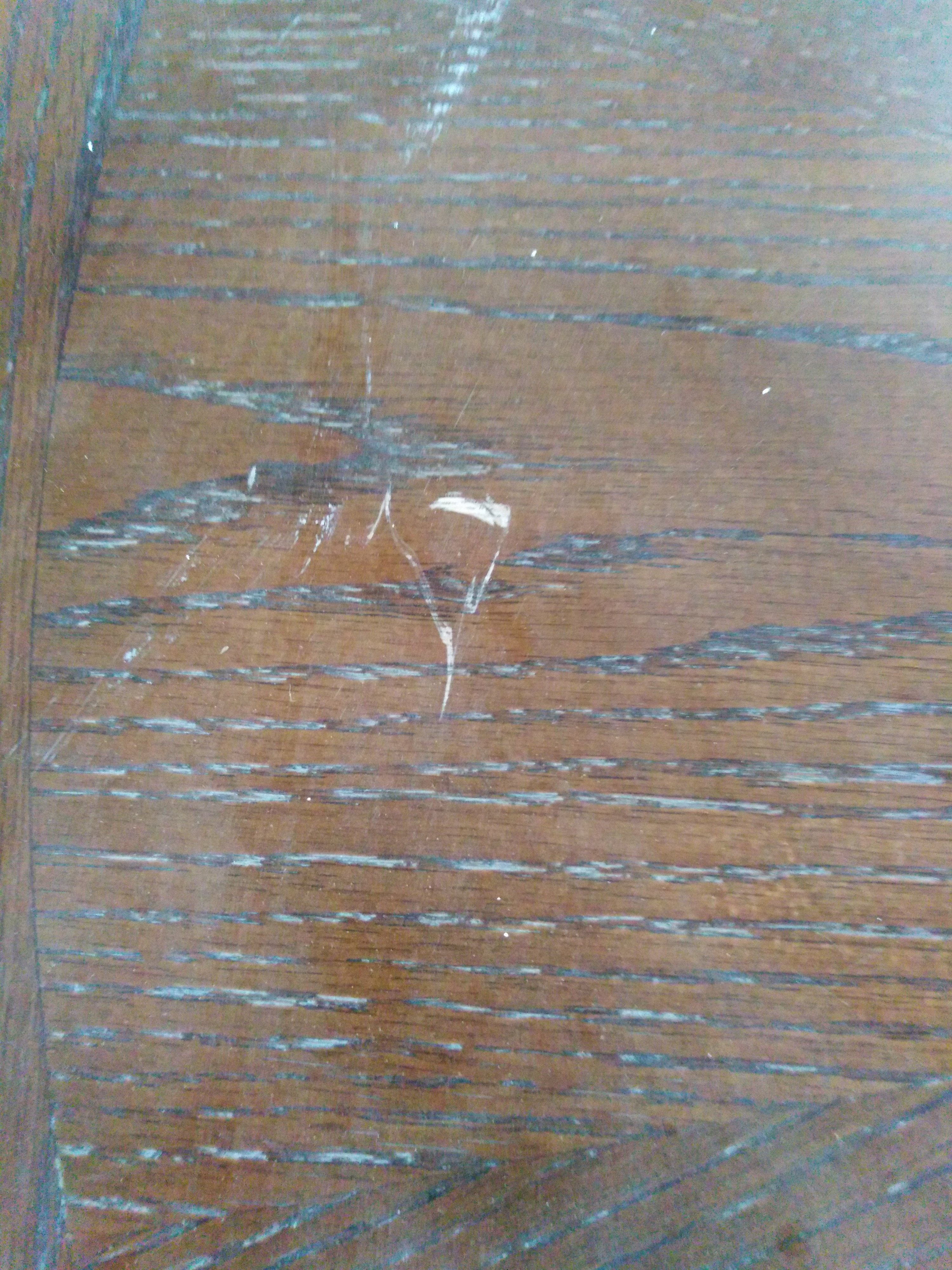 Описание дефекта: Нарушение ЛКП на столешнице и ножках. Царапины, сколы и трещины по деревянным деталям