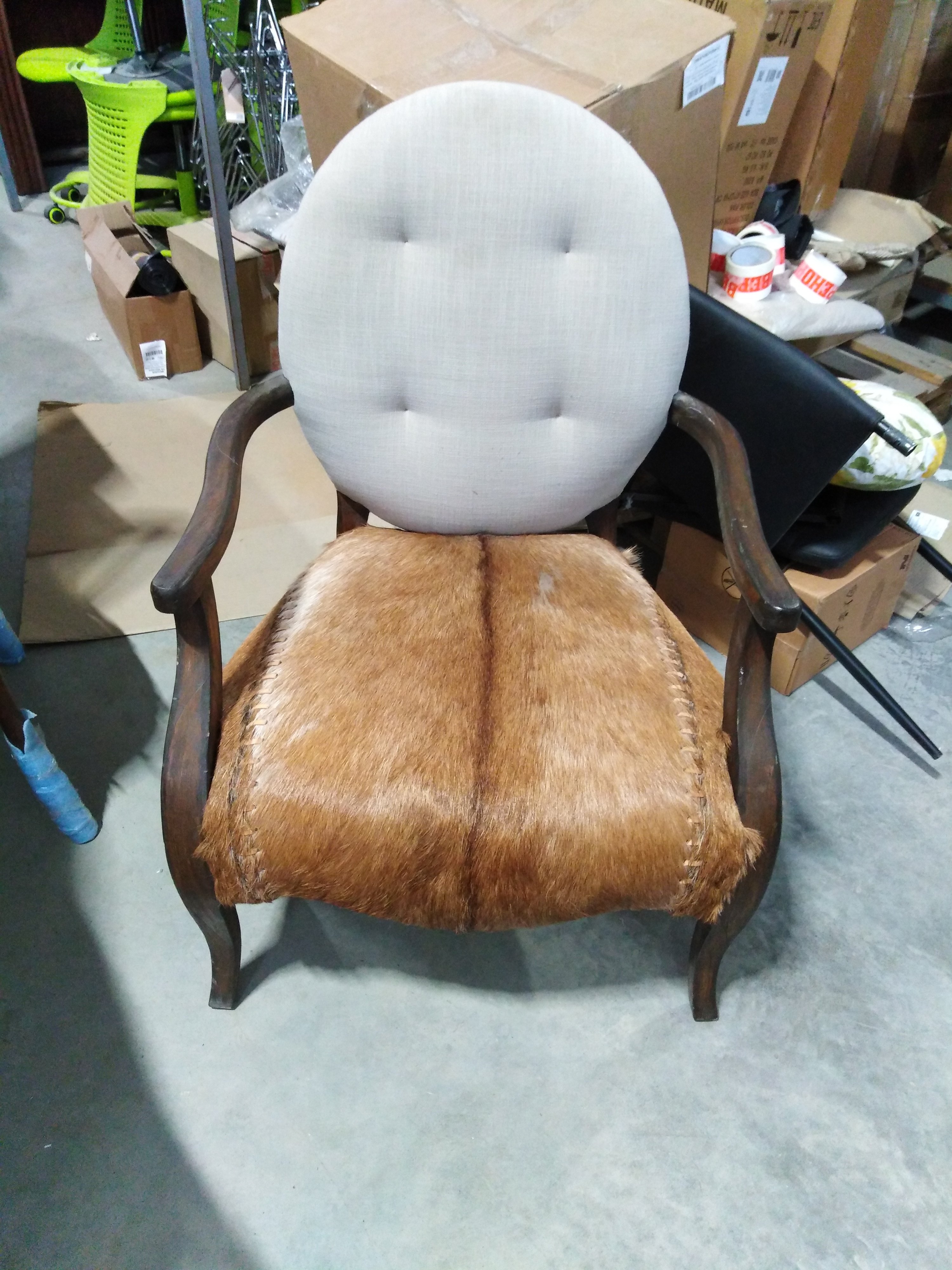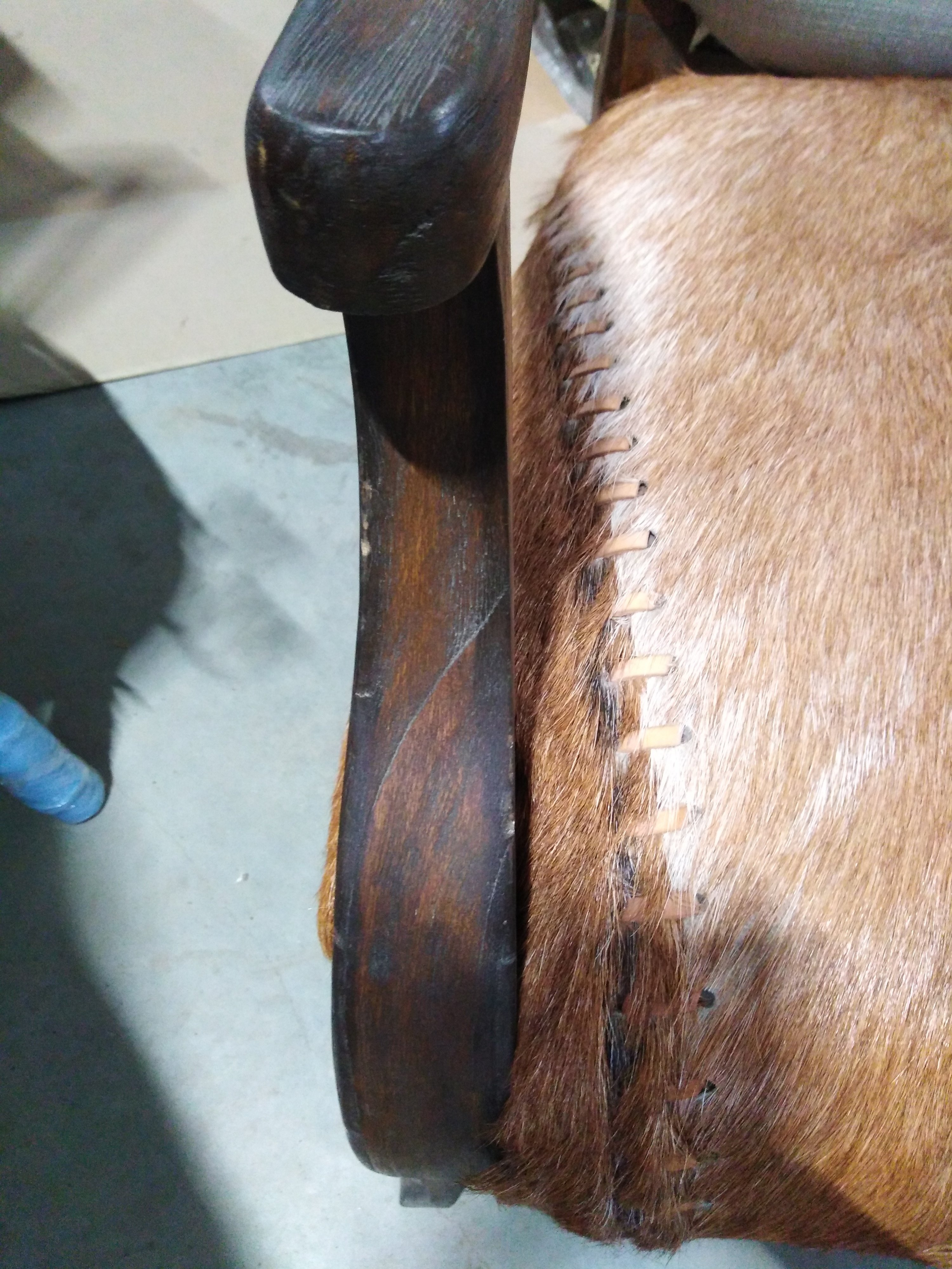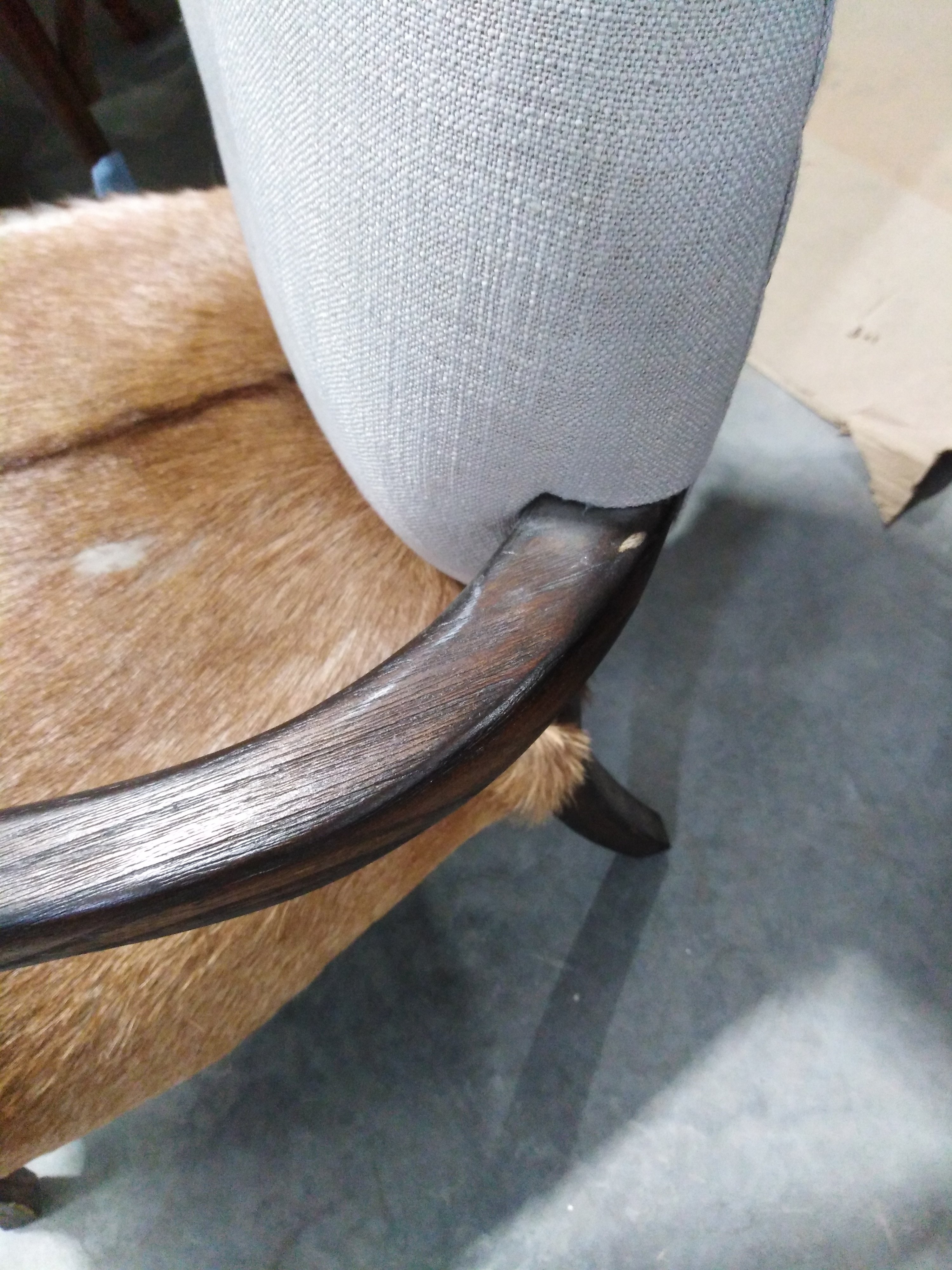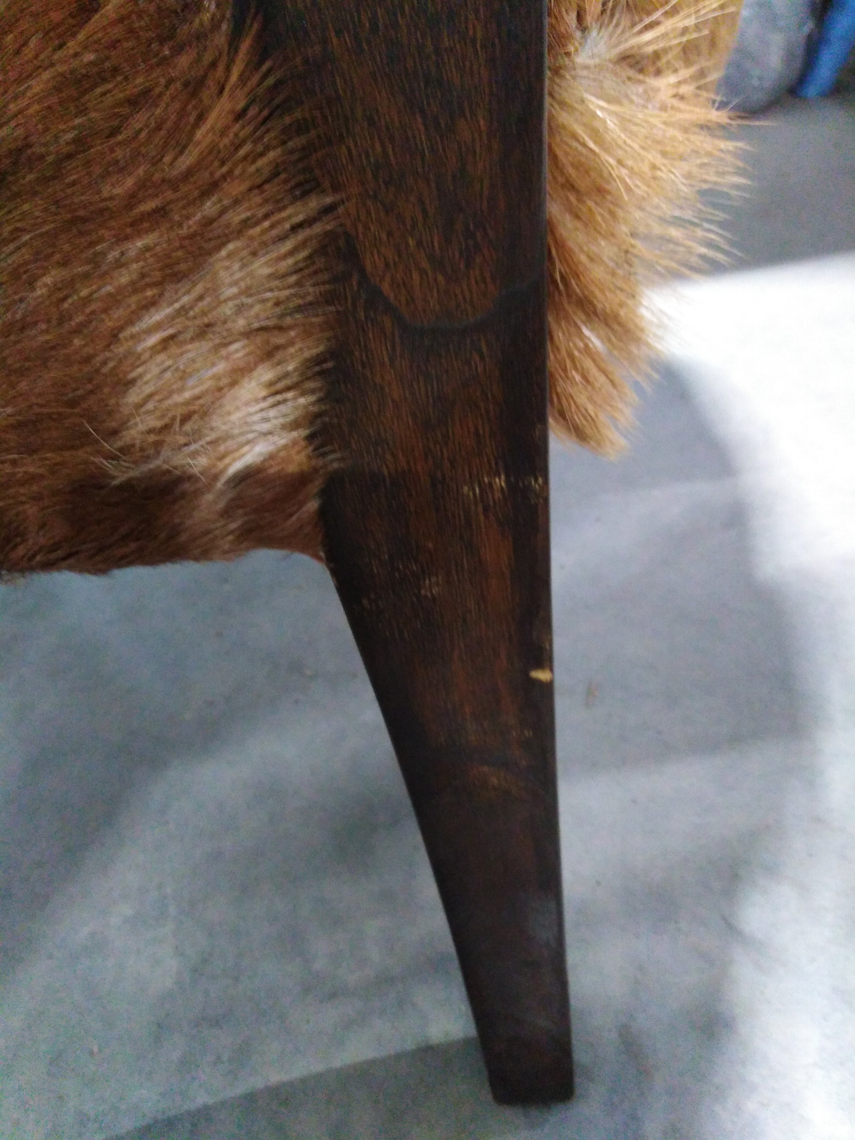 Описание дефекта: Имеются нарушения лакокрасочного покрытия.Вмятины и потертости на деревянных поверхностях ножек и сиденья. Частичное отсутствие ворса на сидении