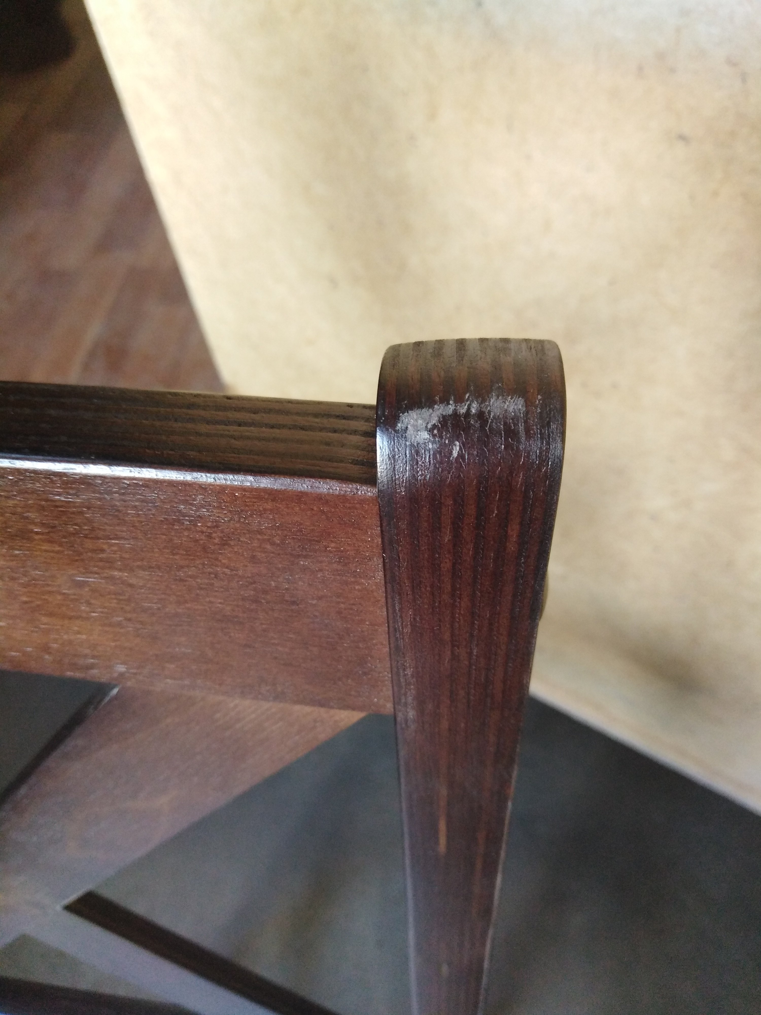 Описание дефекта: Нарушение ЛКП на деревянных поверхностях, микротрещины и сколы. Нарушение структуры материала сидения